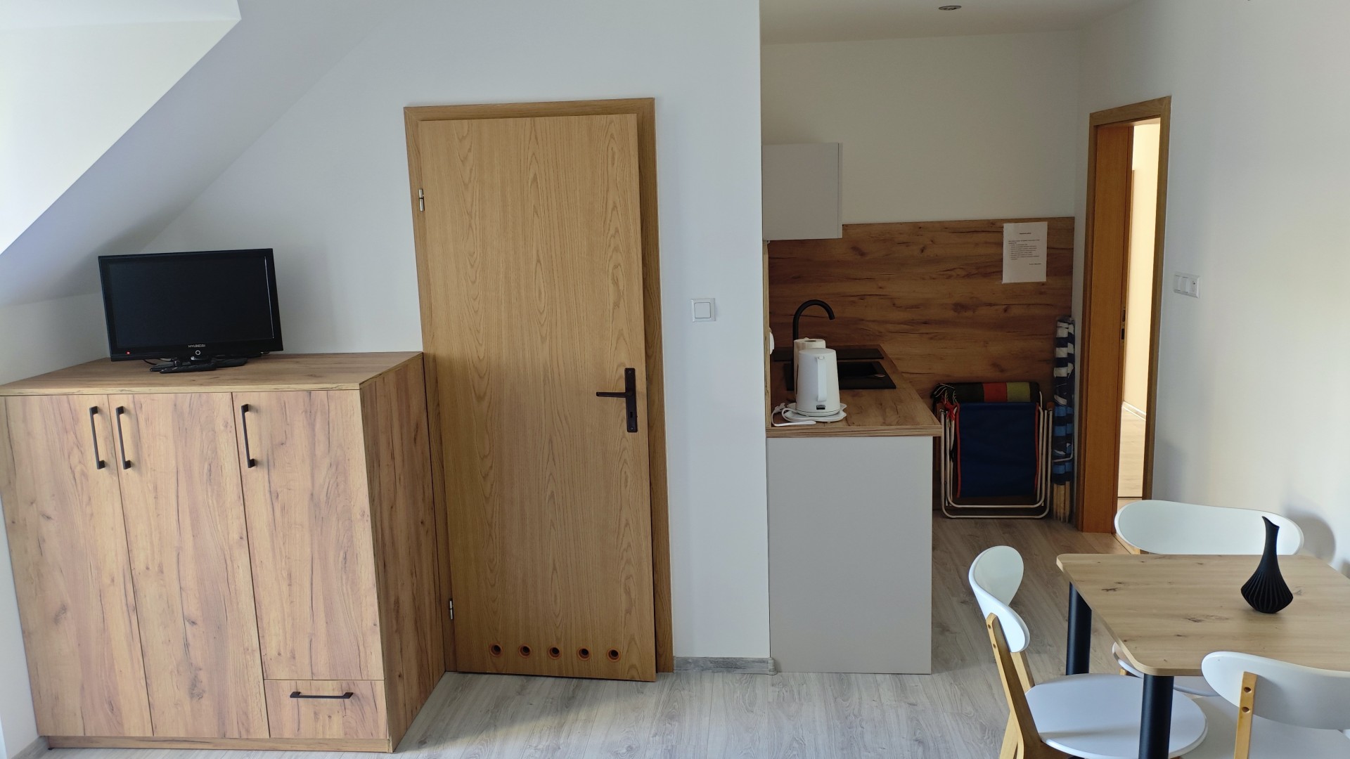 W każdym pokoju, oprócz łazienki, znajduje się także , lodówka, zestaw naczyń i sztućców oraz sprzęt plażowy.