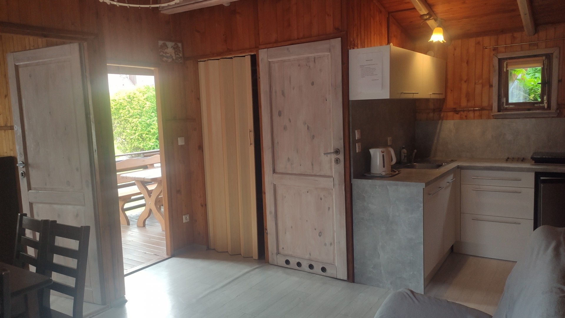 Przed domkiem mogą Państwo wypocząć na niewielkim, zadaszonym tarasie.