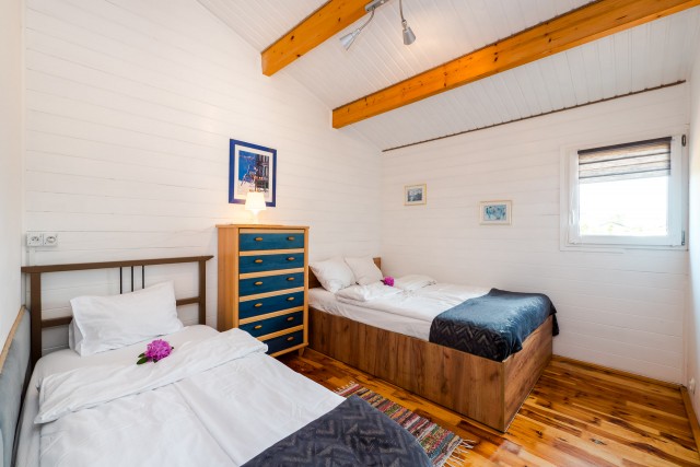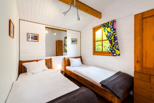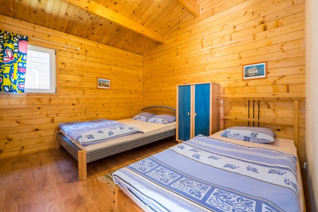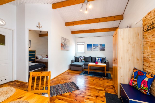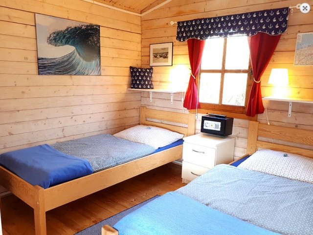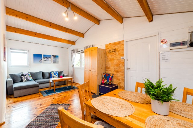 W domkach 4 osobowych macie Państwo do dyspozycji dwa łóżka pojedyncze w sypialni oraz wygodną dużą sofę dla dwóch osób w pokoju dziennym. Natomiast w domkach 5 osobowych znajduje się jedno łóżko podwójne (małżeńskie) i jedno łóżko pojedyncze w sypialni oraz rozkładany narożnik w pokoju dziennym.
