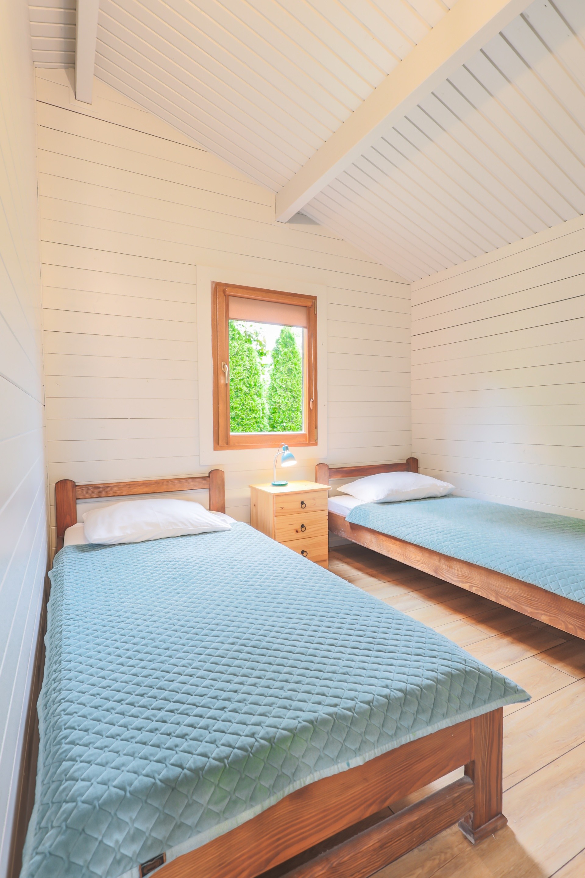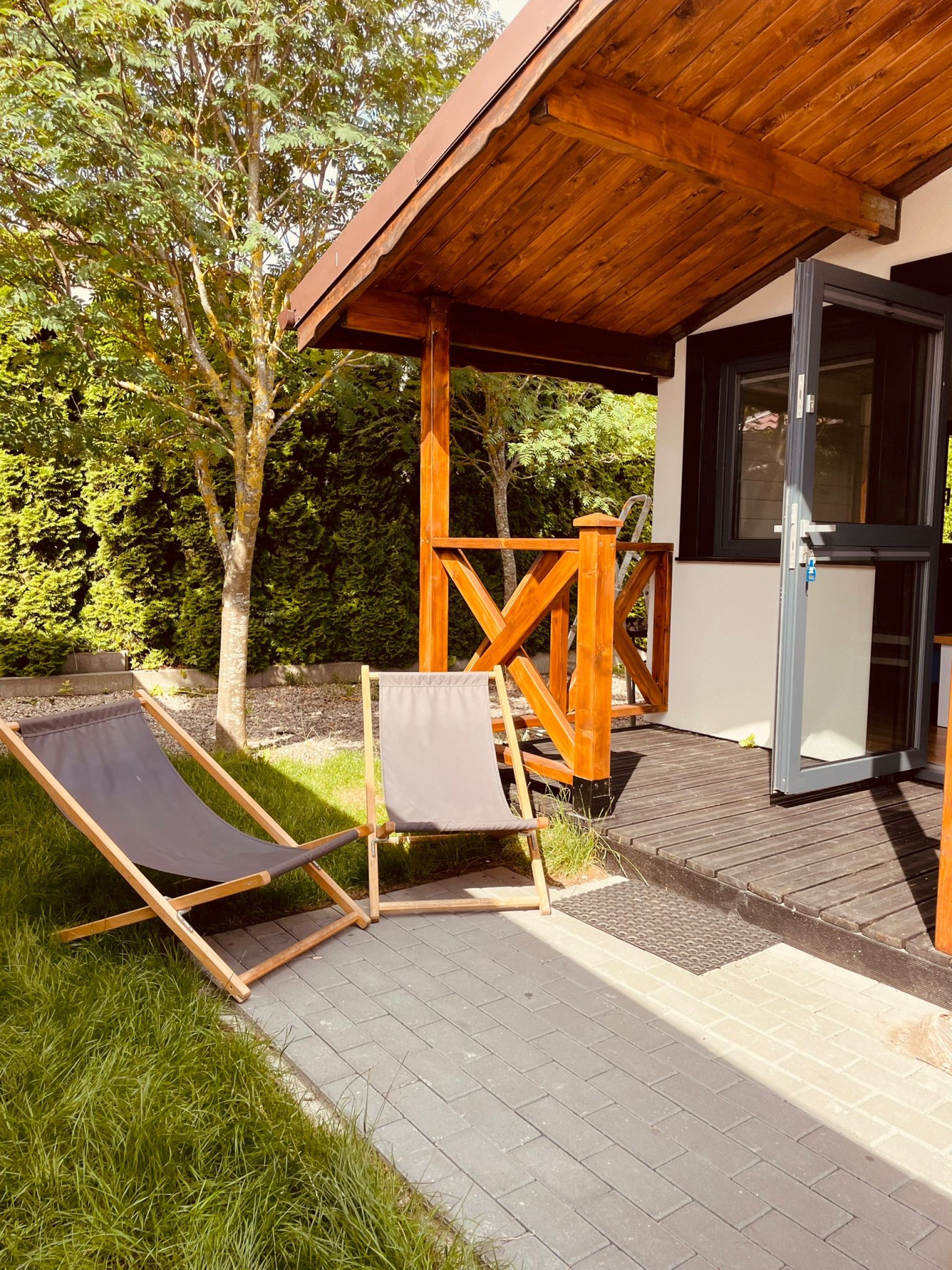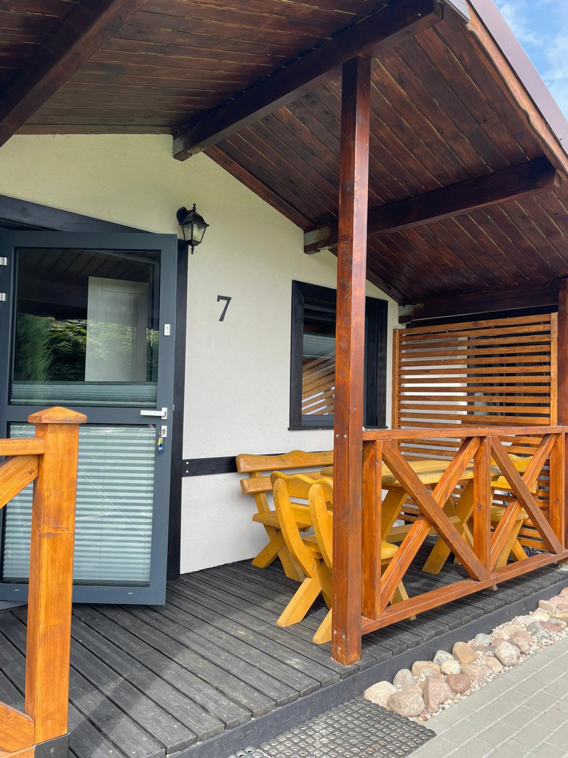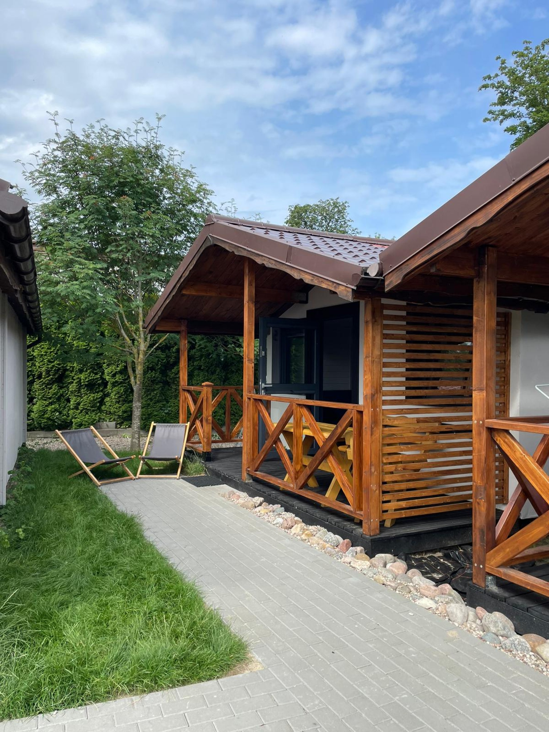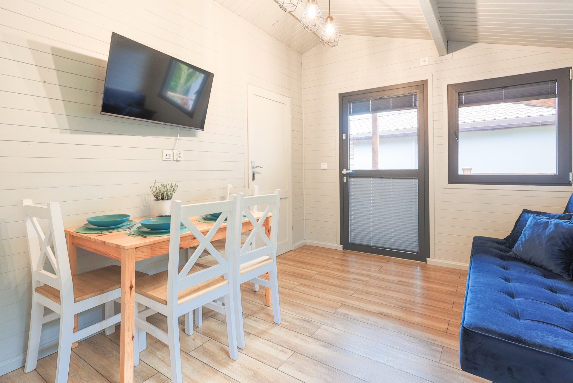 Każdy domek posiada miejsca noclegowe dla 5 osób. – Posiada dwie sypialnie ,salon z aneksem kuchennym oraz łazienka .. Dodatkowo przy każdym z domków jest taras pod zadaszeniem, z meblami ogrodowymi. Dla głodnych słońca na wyposażeniu domku są po dwa leżaki.
