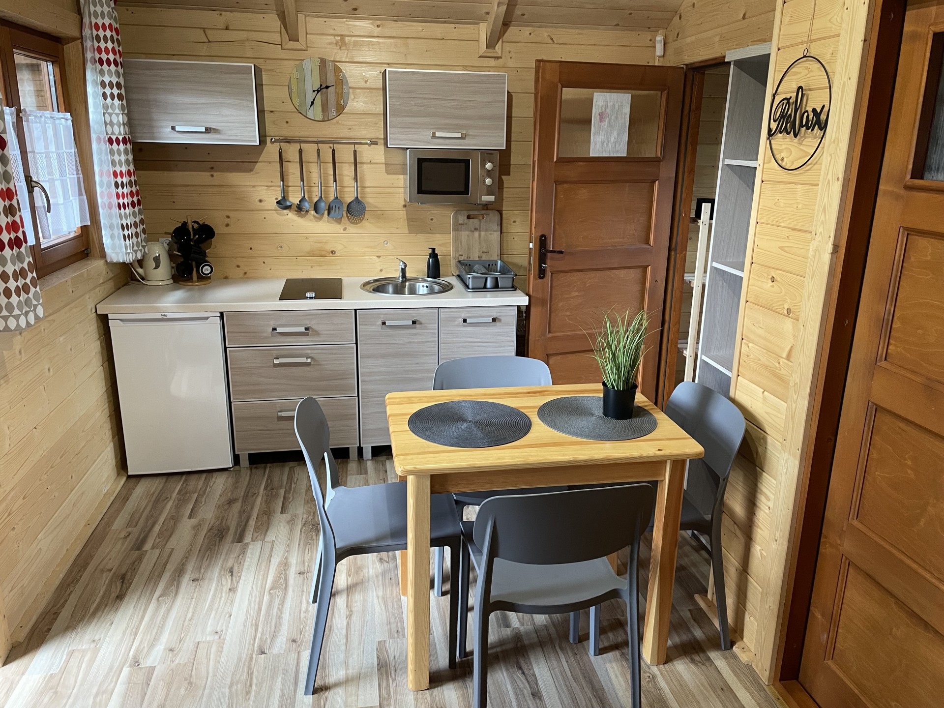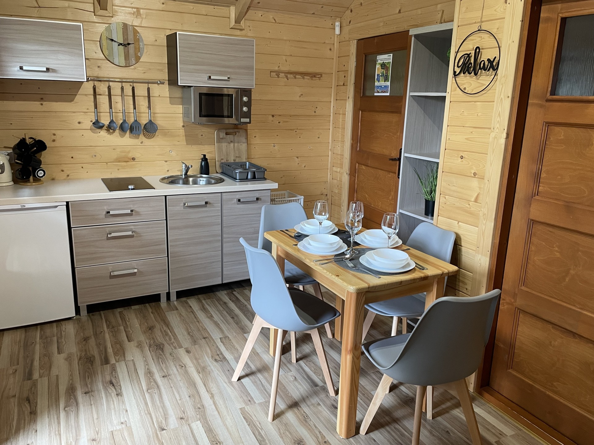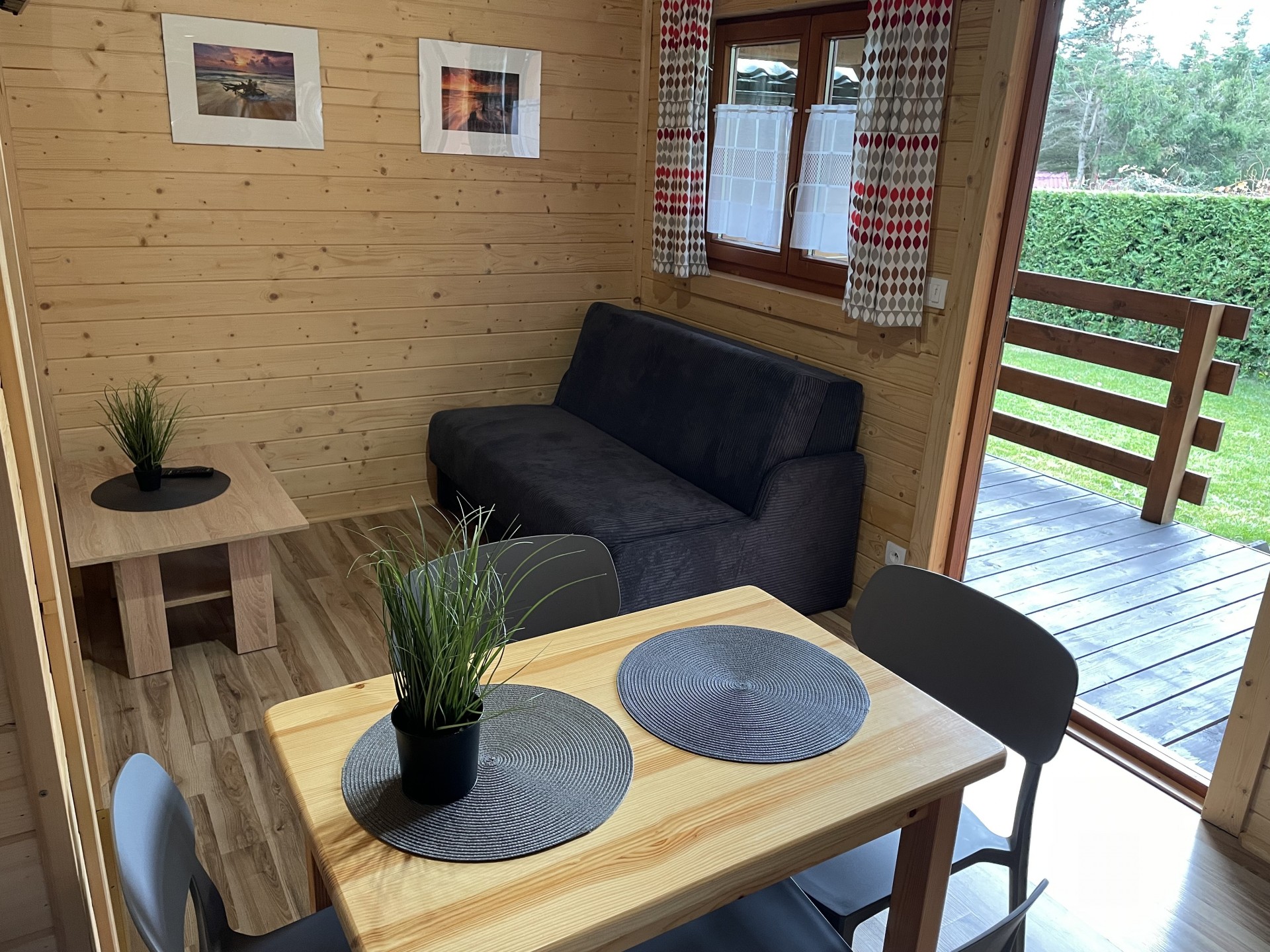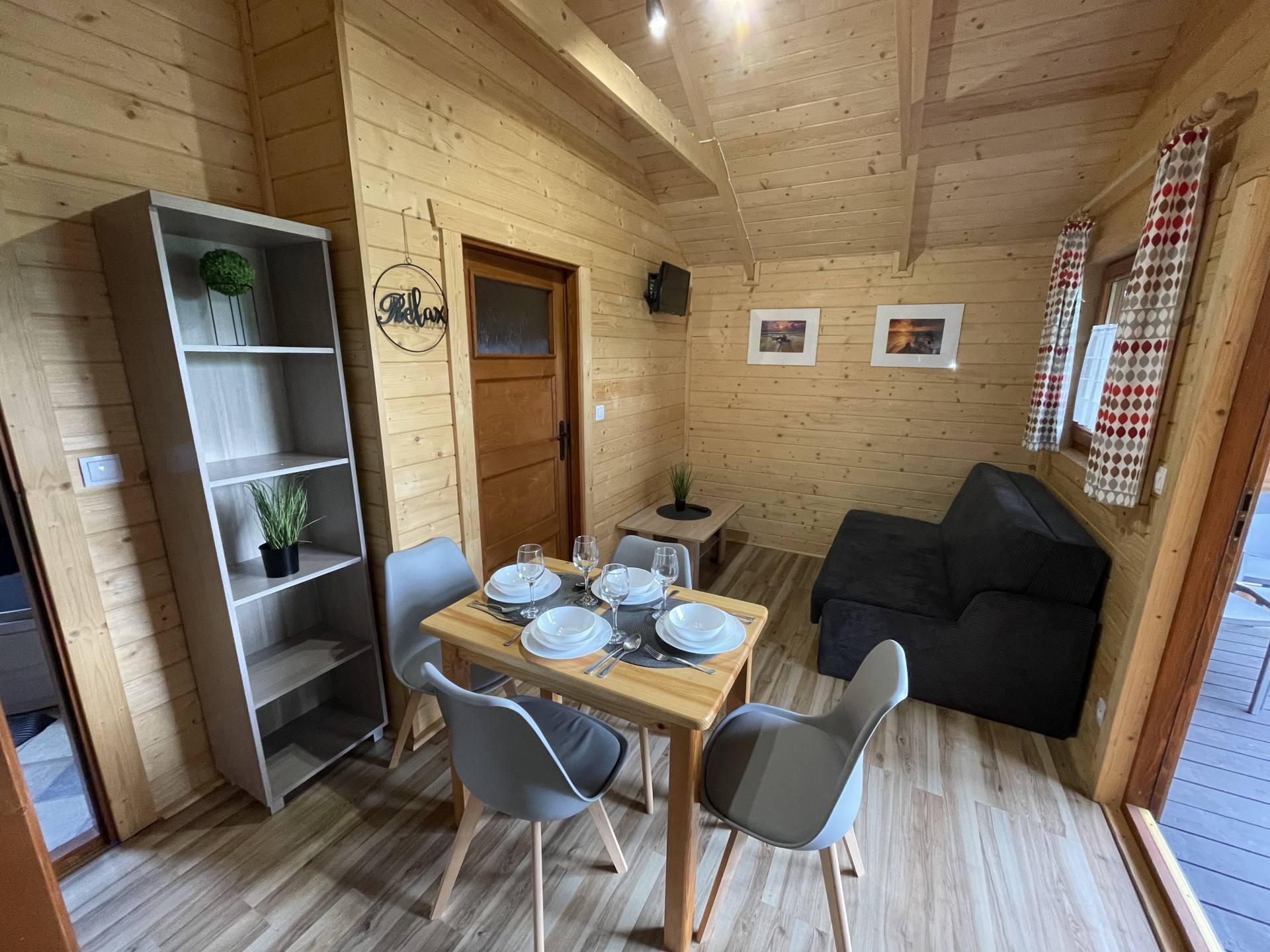 W każdym domku znajduje się salon dzienny z aneksem kuchennym, sypialnia oraz łazienka, zapewniają warunki wypoczynku dla maksymalnie 4-5 osób.