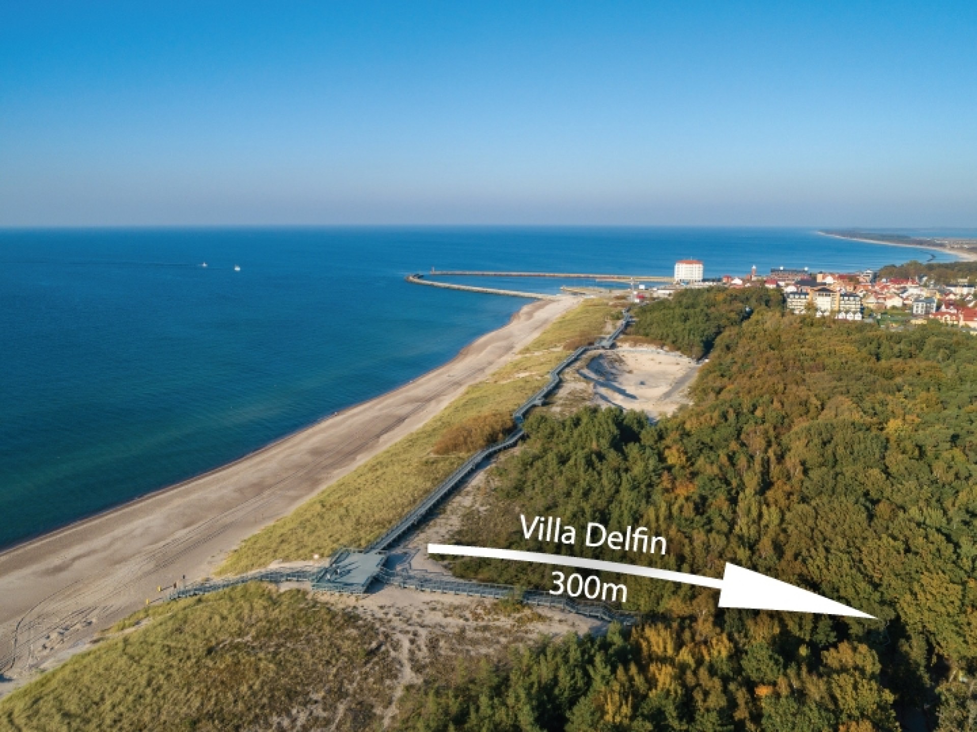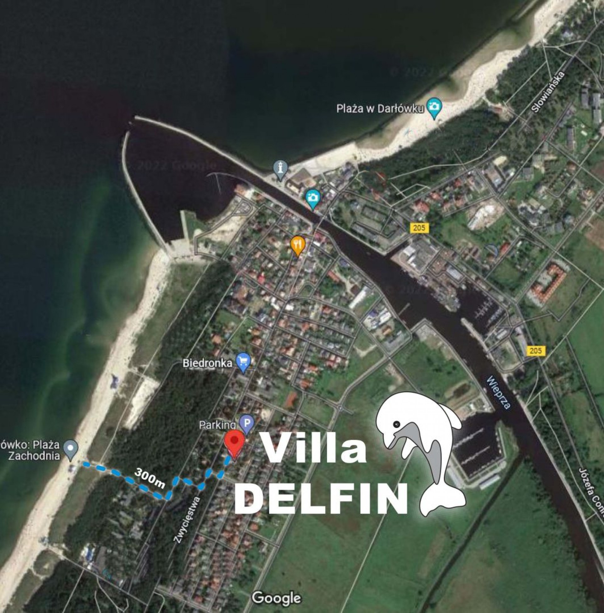 Villa Delfin znajduje się w cichej, zachodniej części Darłówka, w odległości około 300 metrów od szerokiej, czystej plaży.