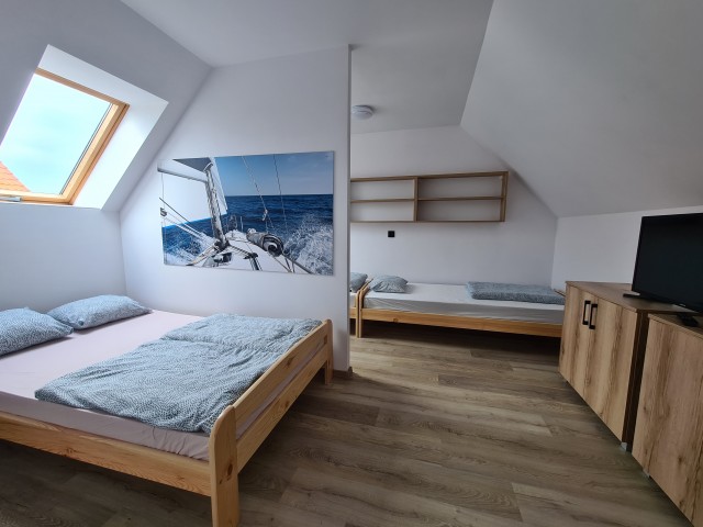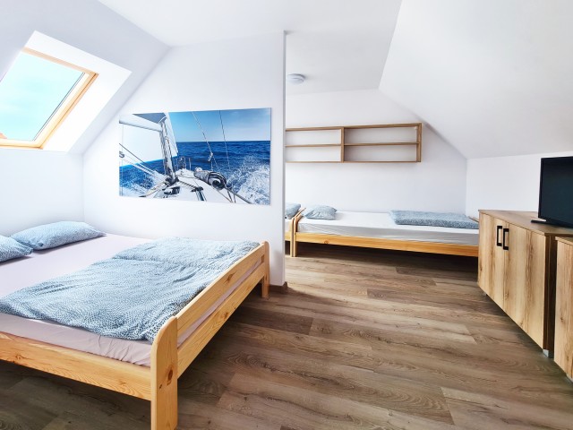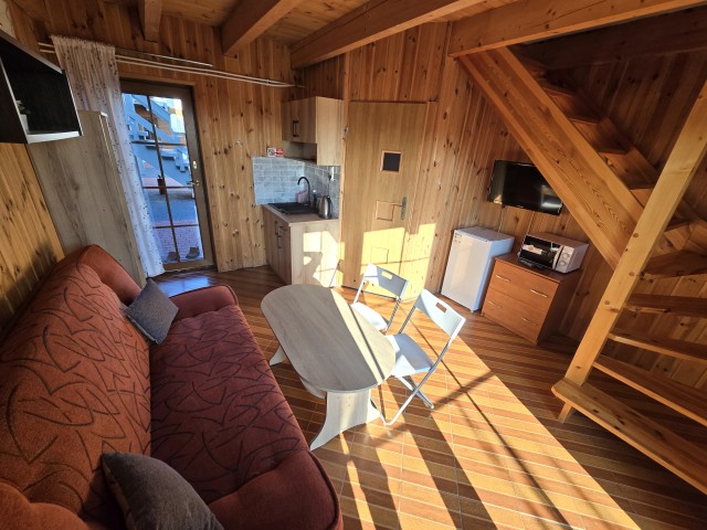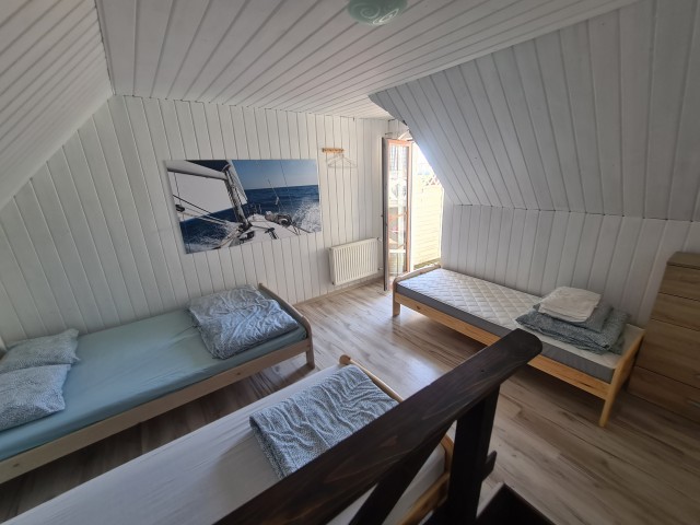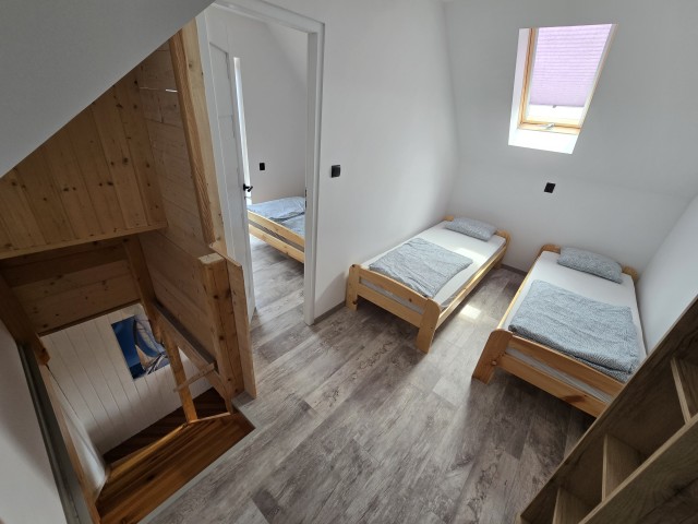 • funkcjonalny układ: na piętrze 3 łóżka, na dole rozkładana sofa 2-osobowa