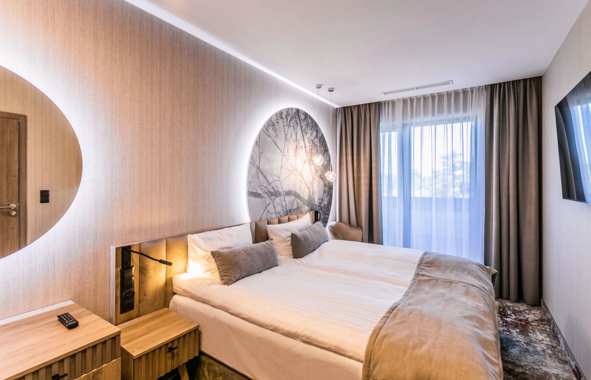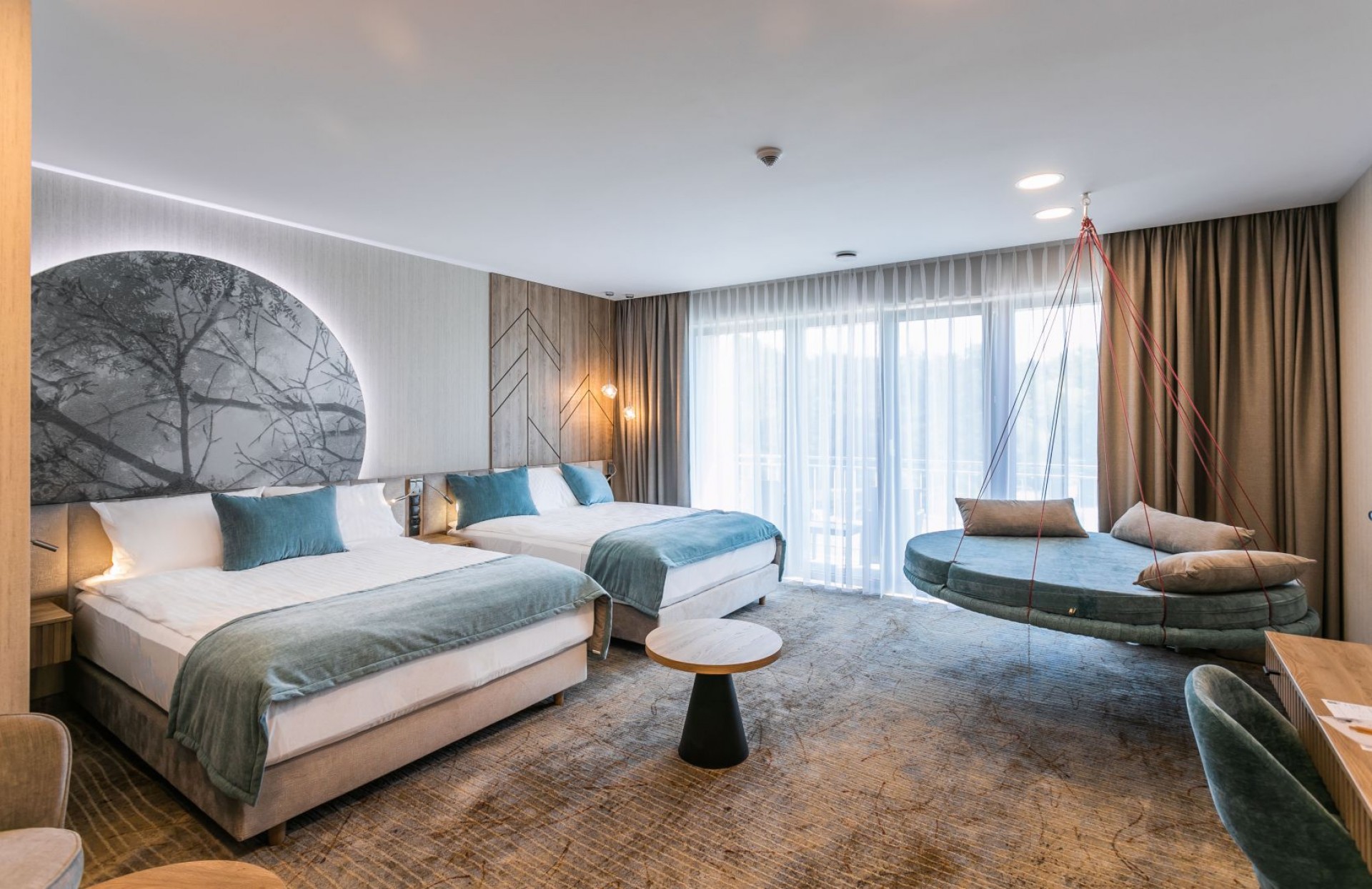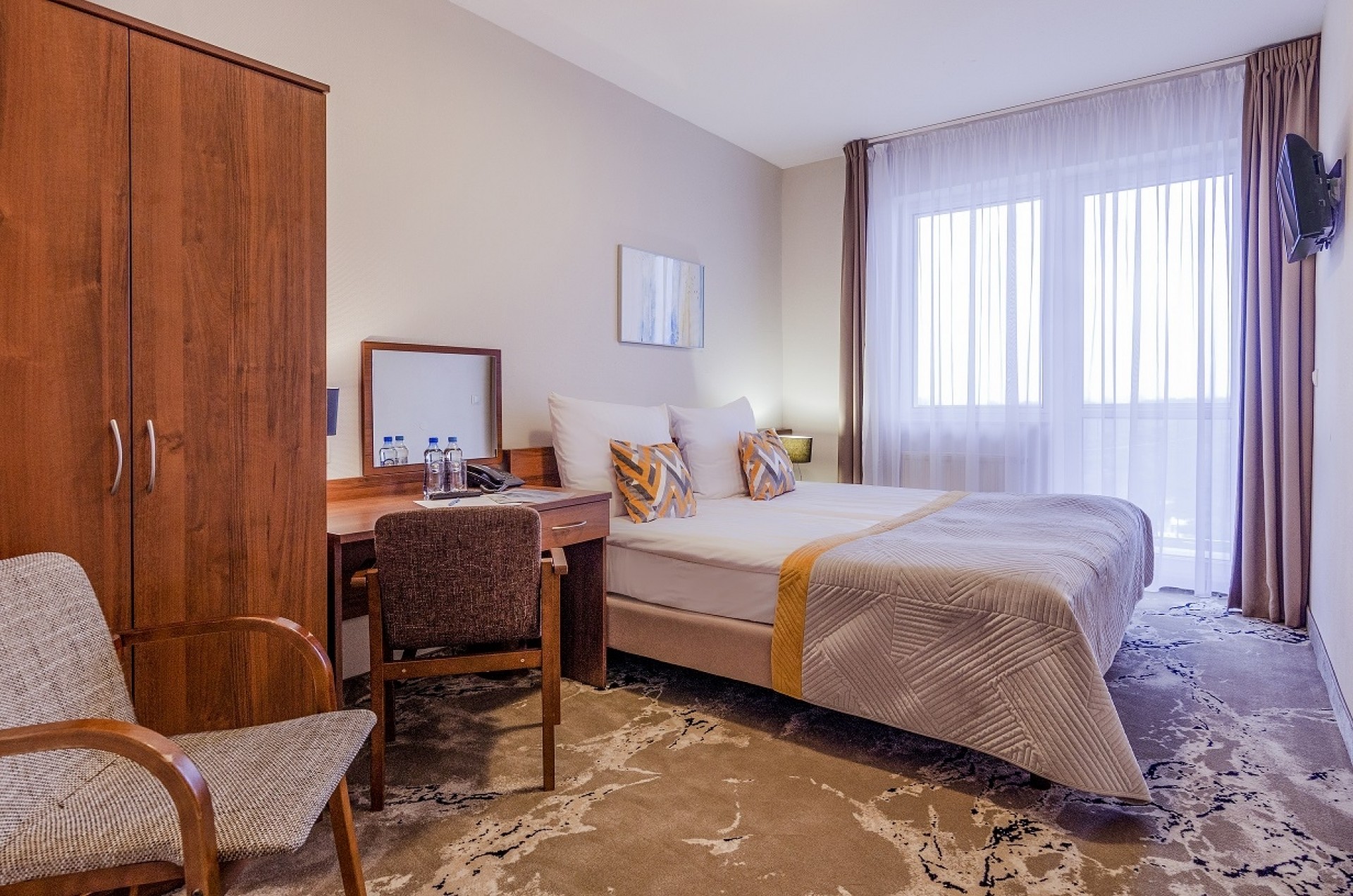 Oferujemy przestronne pokoje w trzech standardach: Standard, Komfort oraz nowoczesne De Luxe. Każdy z nich wyposażony jest w prywatną łazienkę, telewizję kablową oraz bezpłatne Wi-Fi, a większość posiada balkon. Pokoje De Luxe to propozycja dla osób ceniących najwyższy standard – eleganckie wnętrza z charakterystyczną huśtawką, klimatyzacją oraz minibarem zapewniają wyjątkowe warunki pobytu.