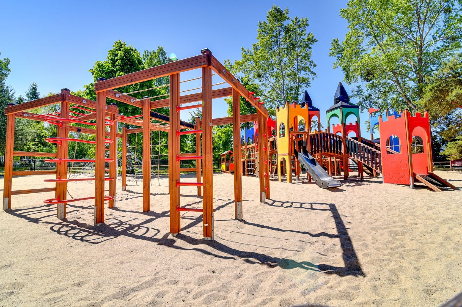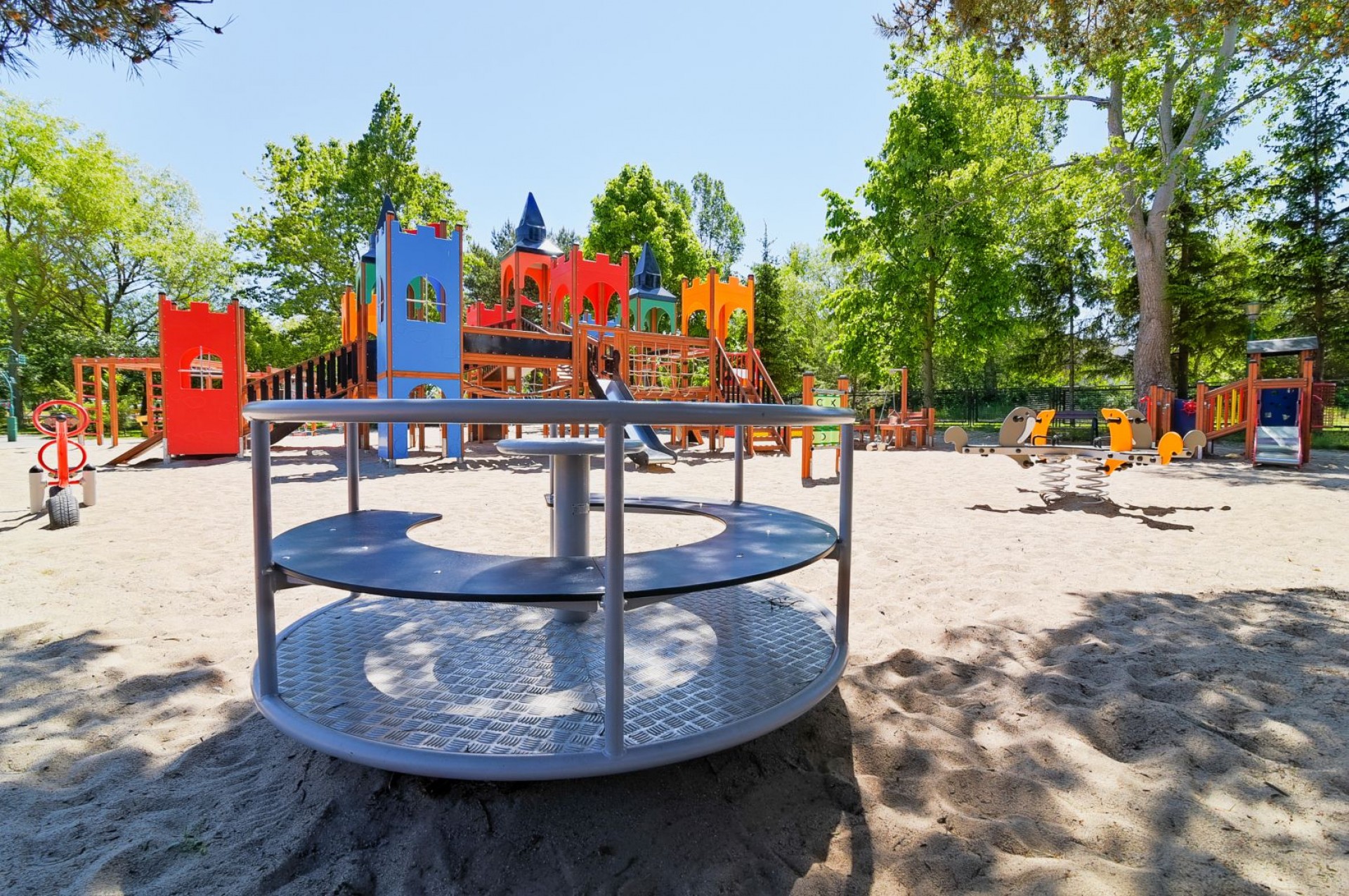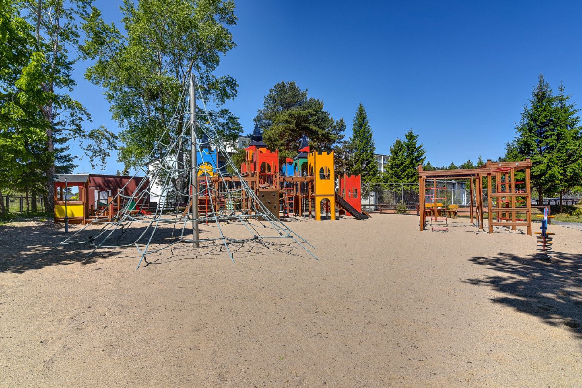 dwa zewnętrzne place zabaw oraz rowery z fotelikami dziecięcymi.