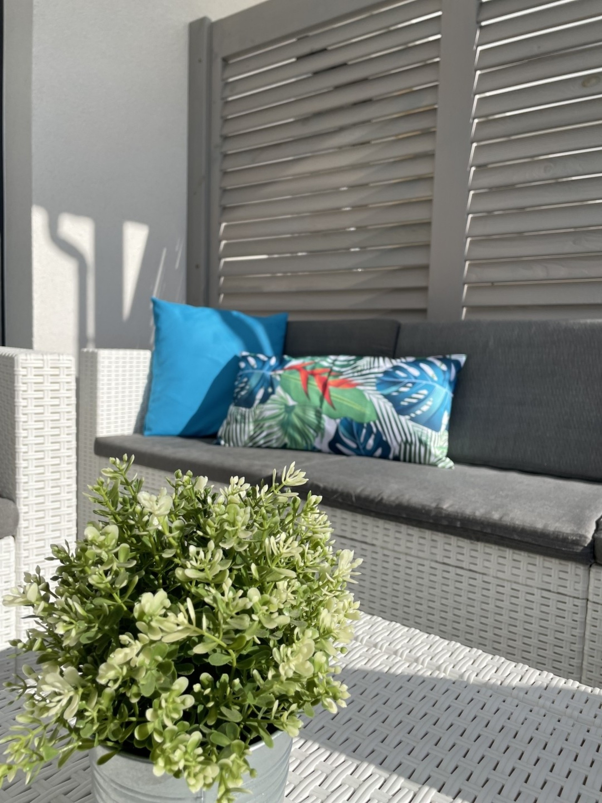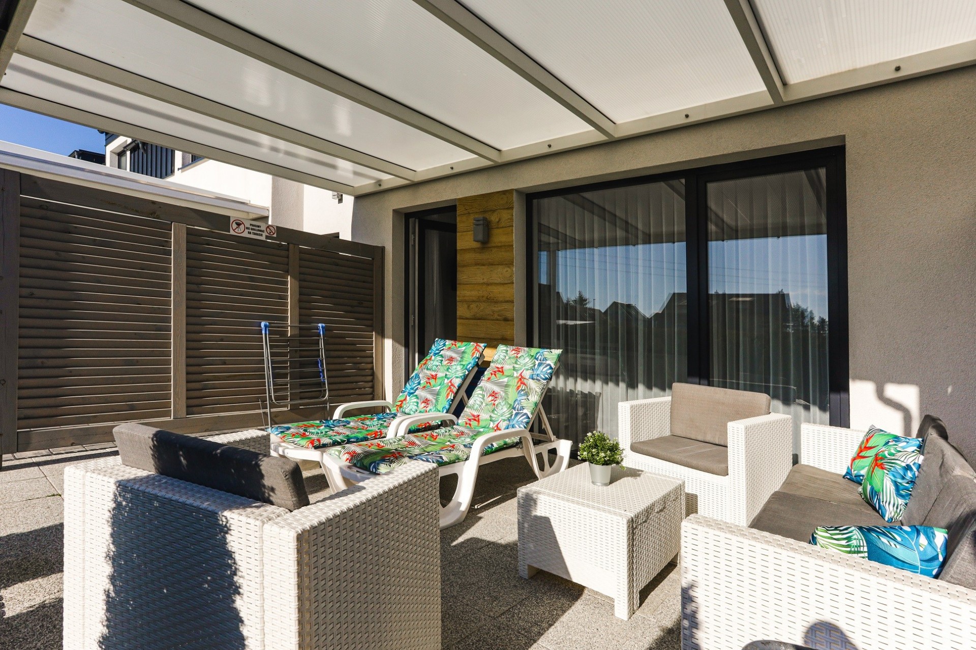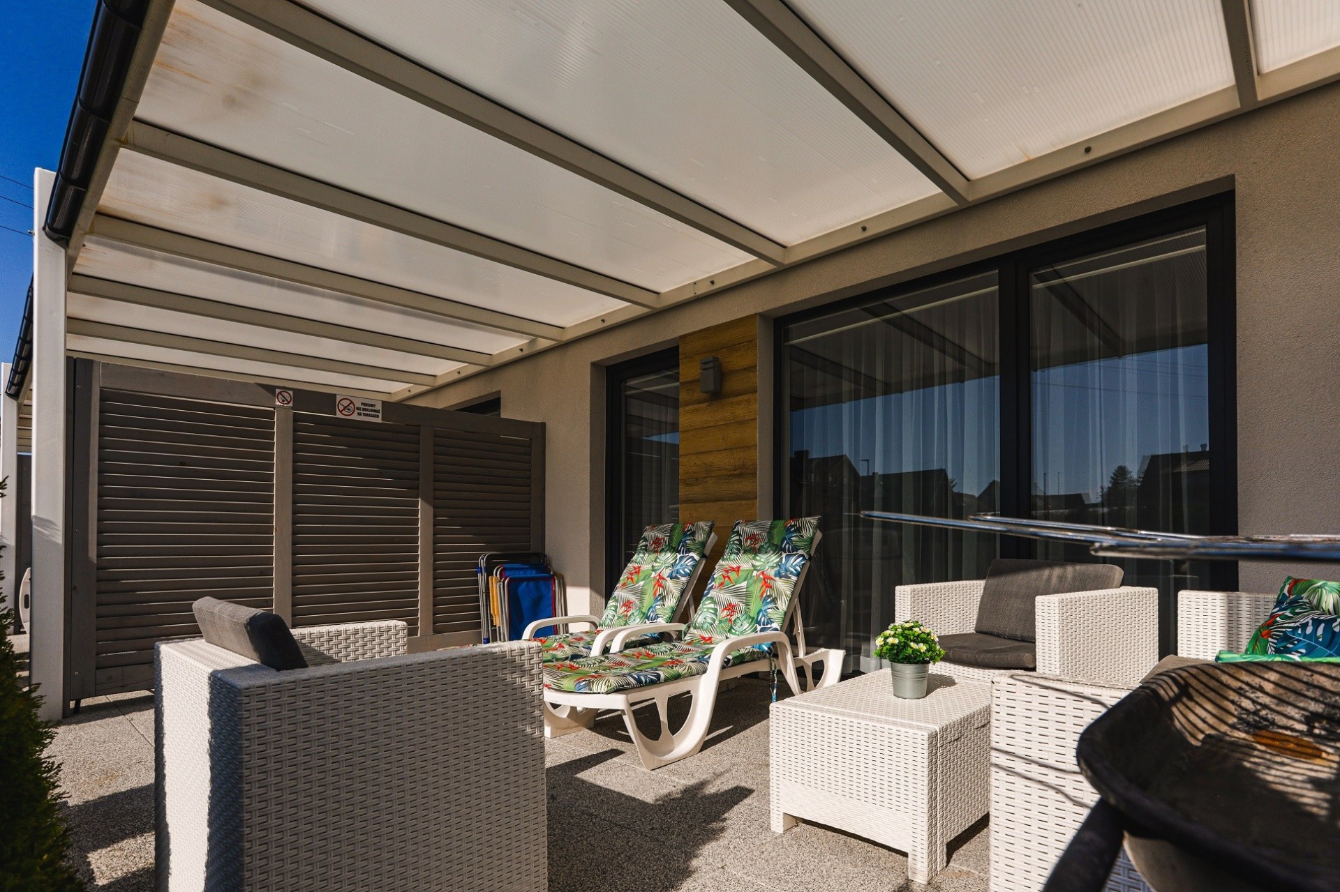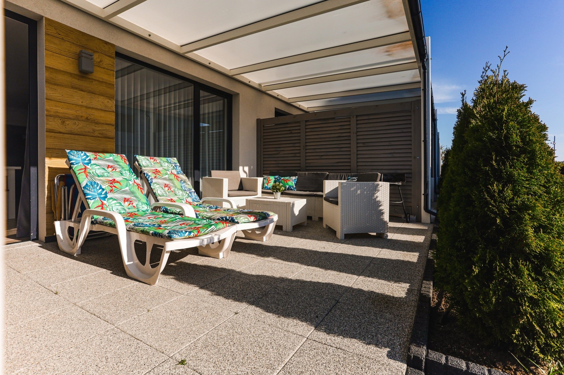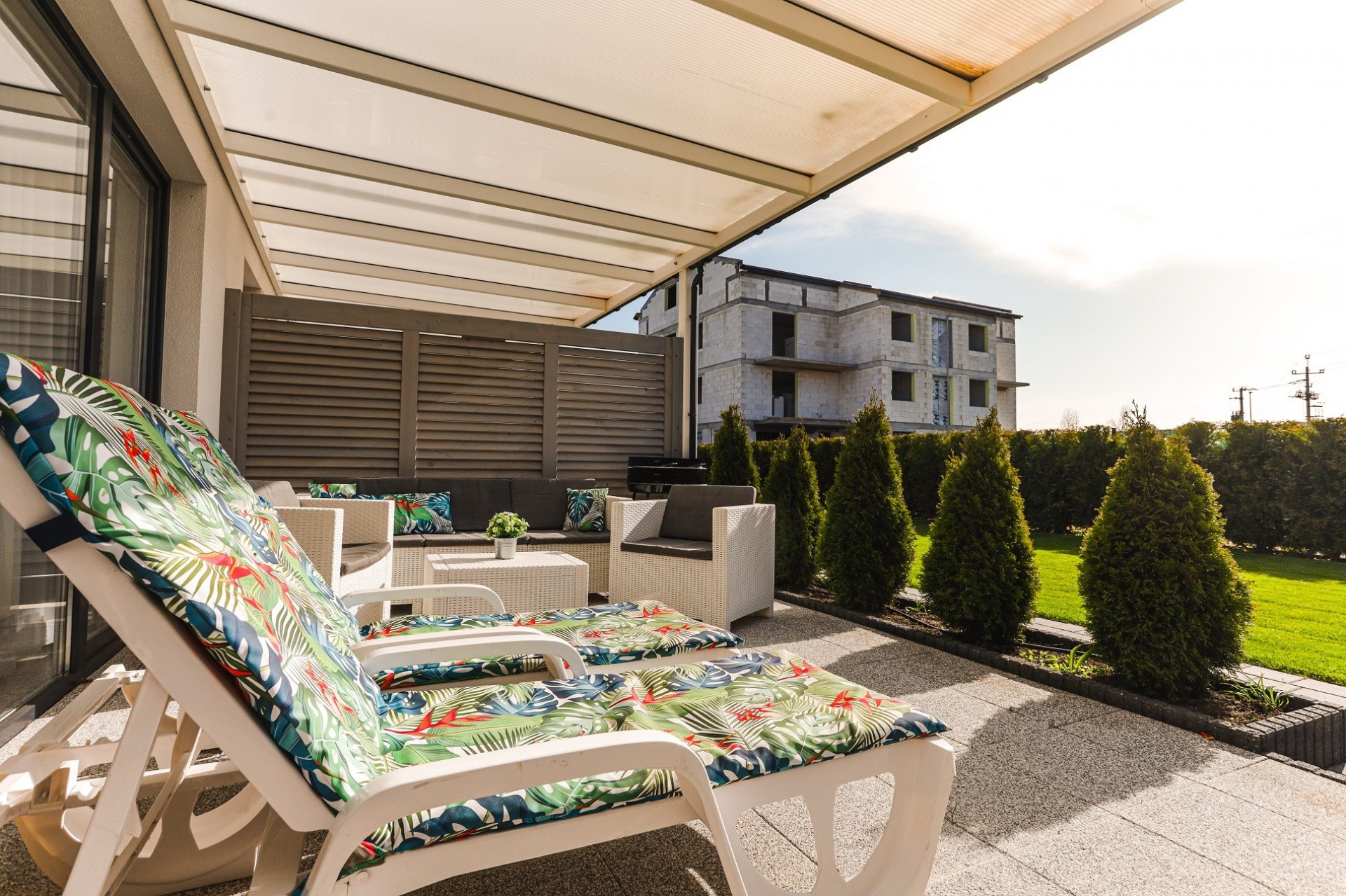 - taras z meblami wypoczynkowymi, leżaki, suszarka na bieliznę