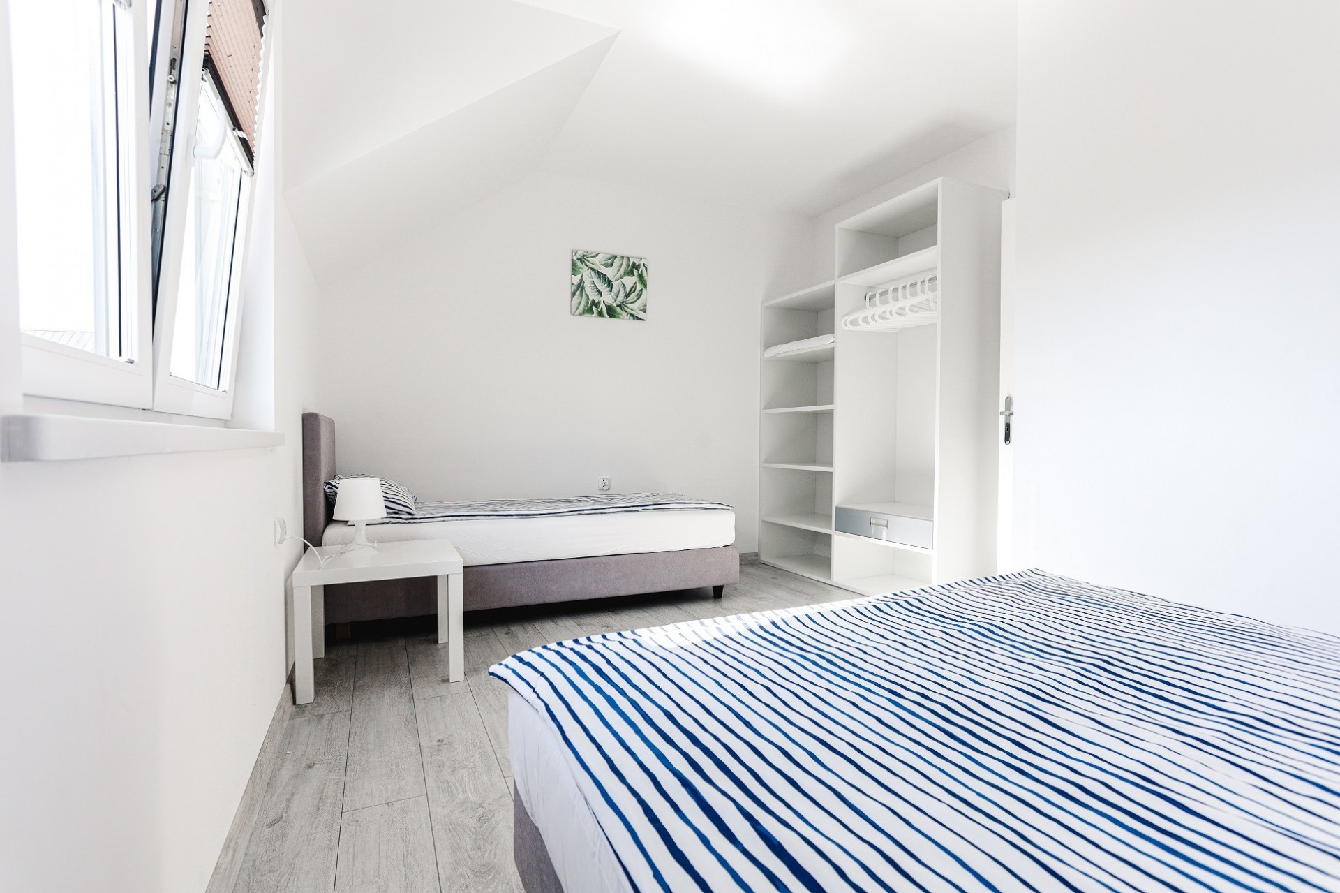 Na piętrze znajdują się dwie oddzielne sypialnie, dodatkowa toaleta.