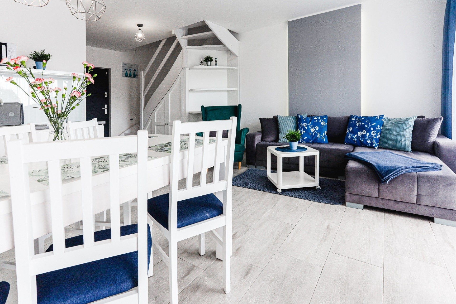 Na parterze domku znajduje się salon z sofą wypoczynkową, tvLED 40cali, stół z krzesłami, aneks kuchenny z pełnym wyposażeniem (naczynia, sztućce, garnki, czajnik elektryczny, kuchenka mikrofalowa, płyta grzewcza, lodówka, zmywarka),