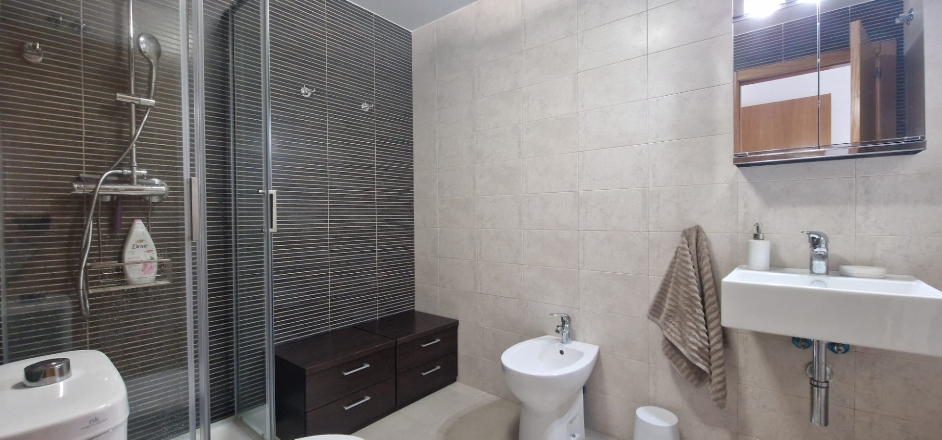 Apartament ma 2 sypialnie, 2 łazienki, zamykany salon z rozkładaną sofą i otwartą kuchnią, ogromny zadaszony taras z niesamowitym widokiem niczym z Karaibów. Całkowita powierzchnia to 105m2