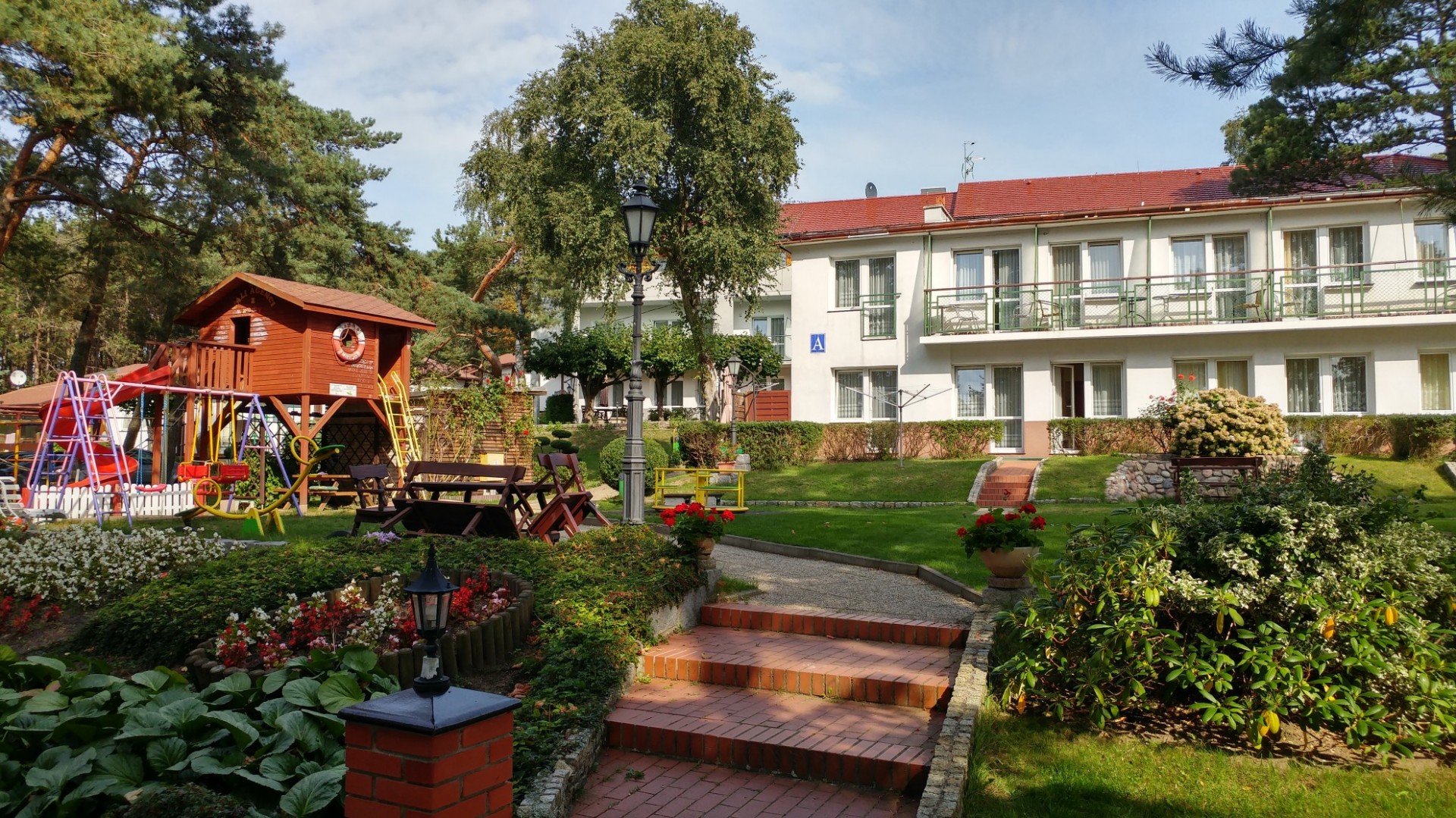 Obiekt dysponuje 100 miejscami w apartamentach i pokojach 1, 2 i 3-osobowych z łazienkami lub w domkach murowanych (3,4,8 -osobowych).