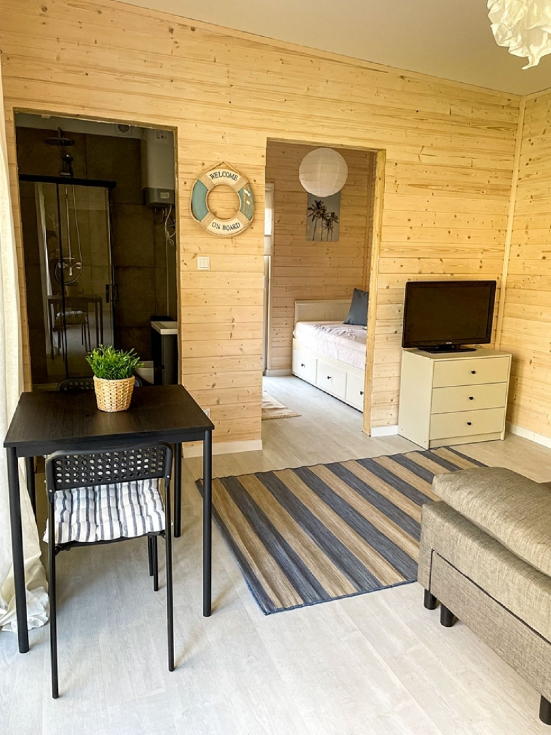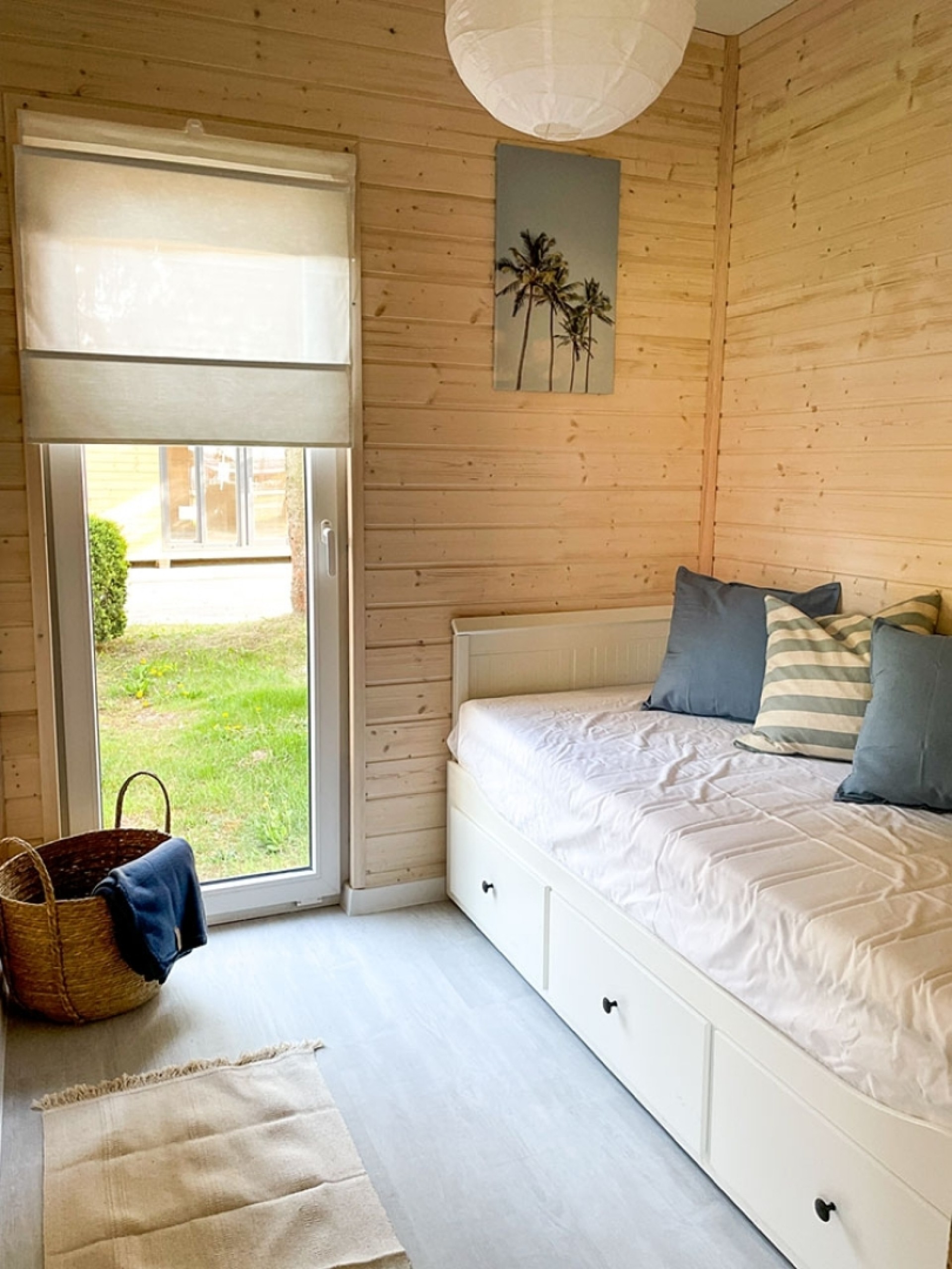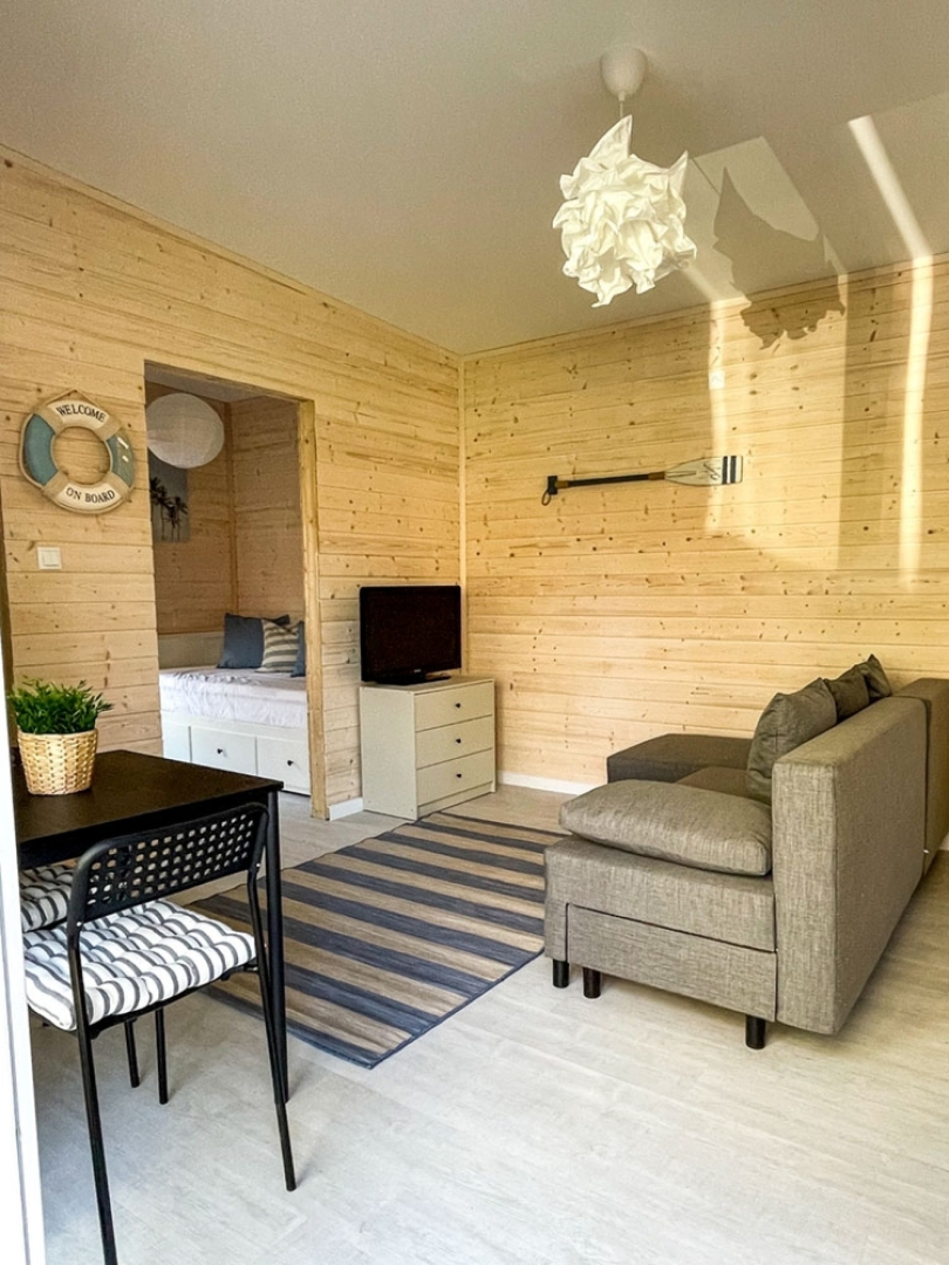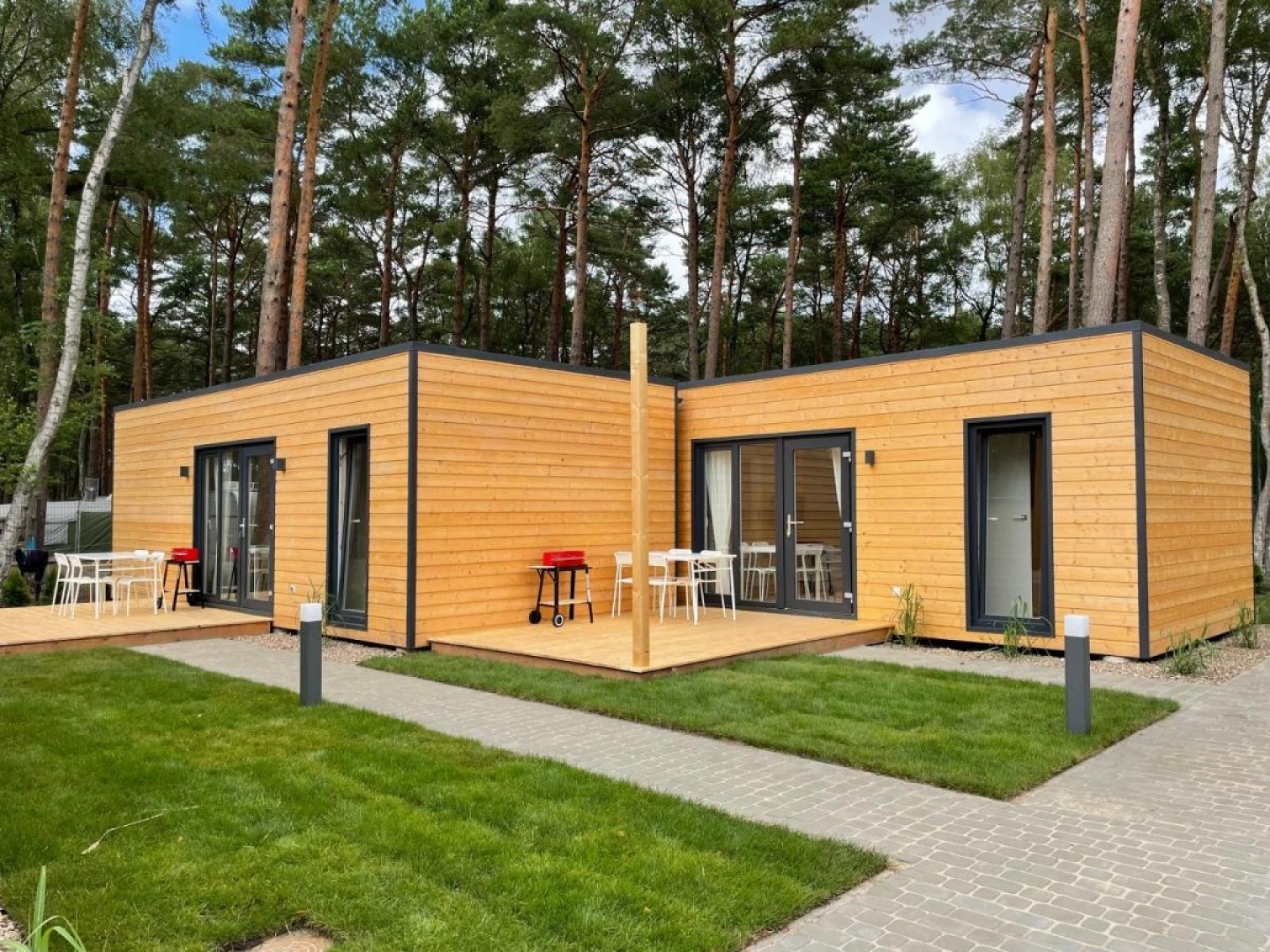 Domki składają się z dwóch sypialni (głównej oraz dziecięcej), salonu z aneksem kuchennym oraz łazienki. Są w pełni wyposażone. Z salonu jest wyjście na taras oraz ogród.
