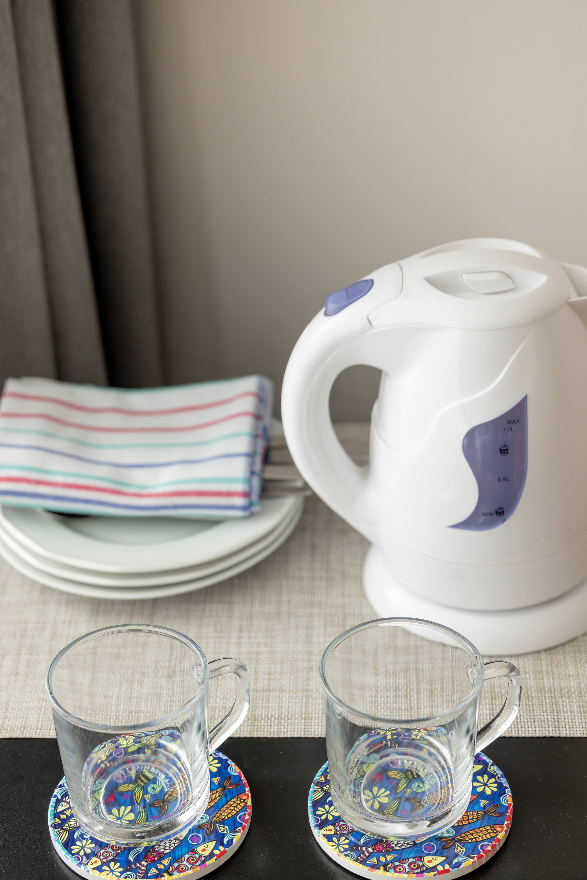 - podstawowe naczynia (szklanki, talerze, sztućce)