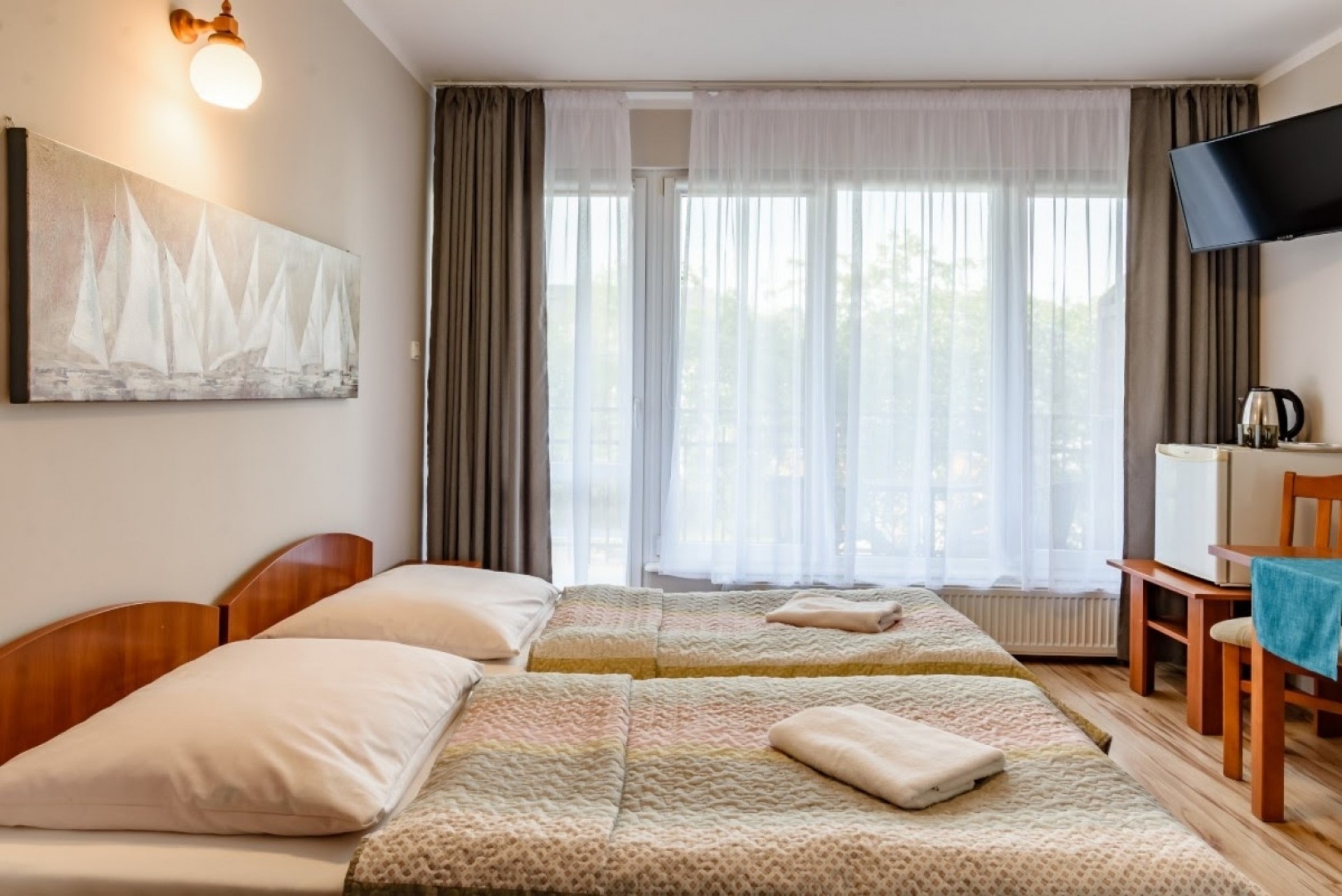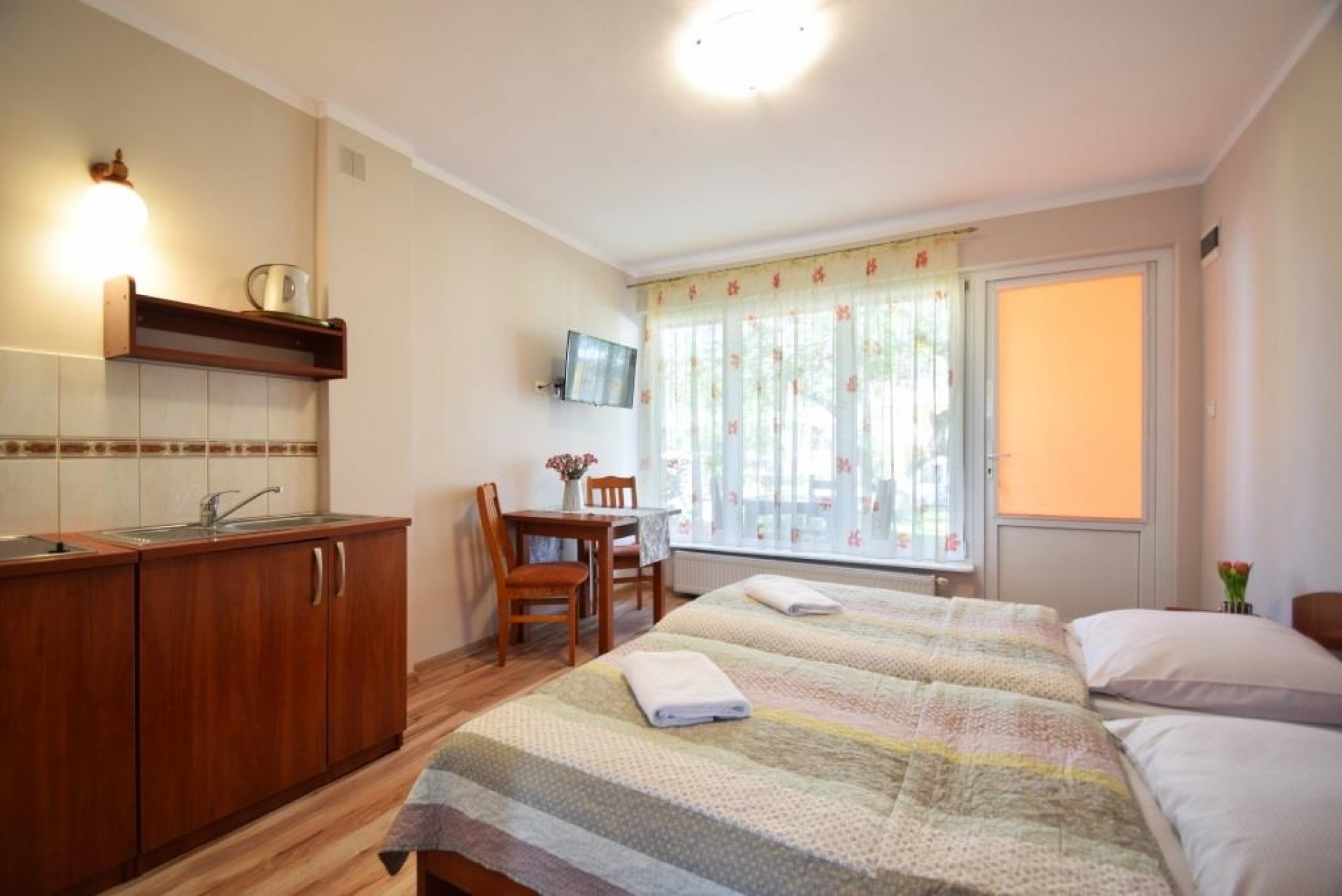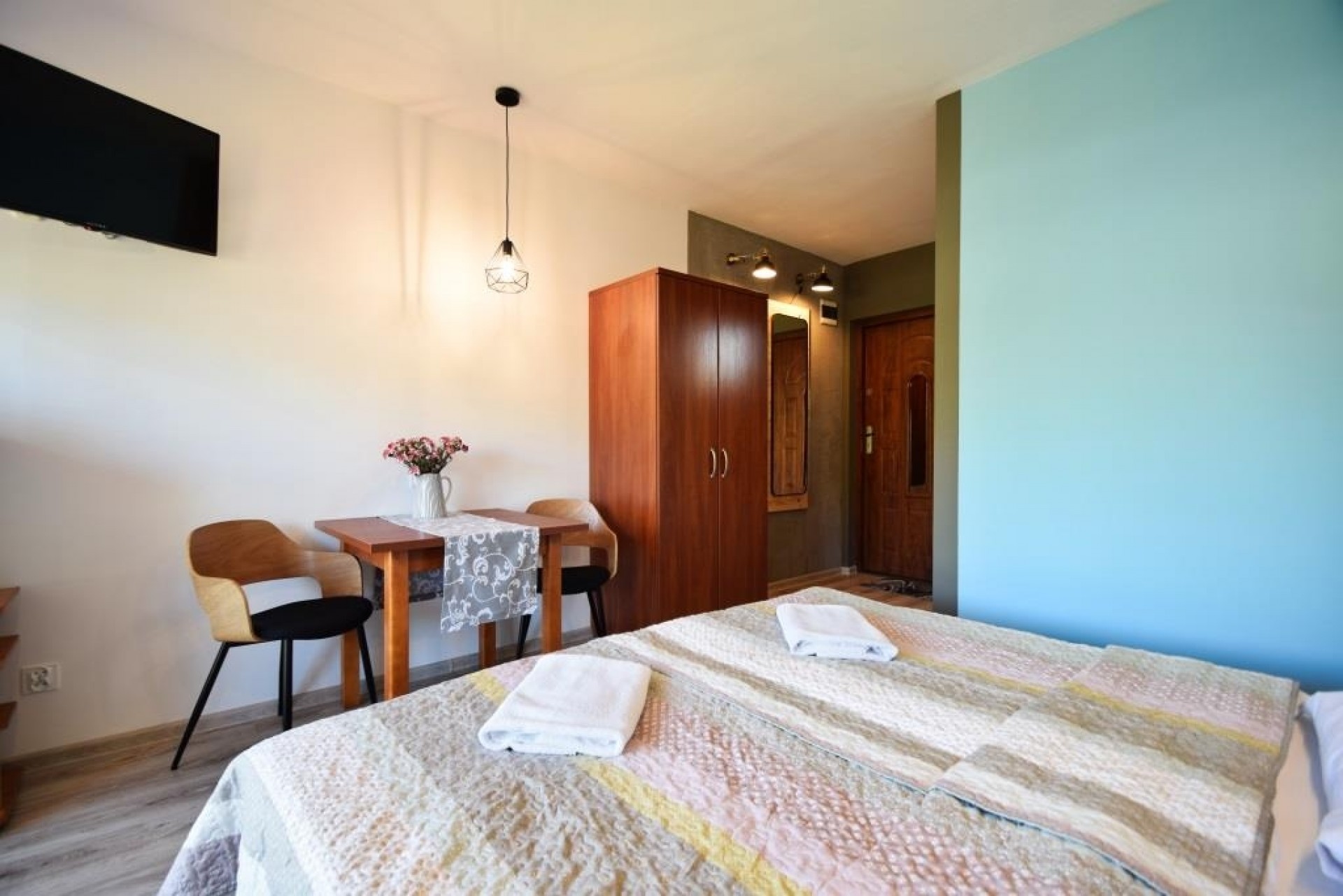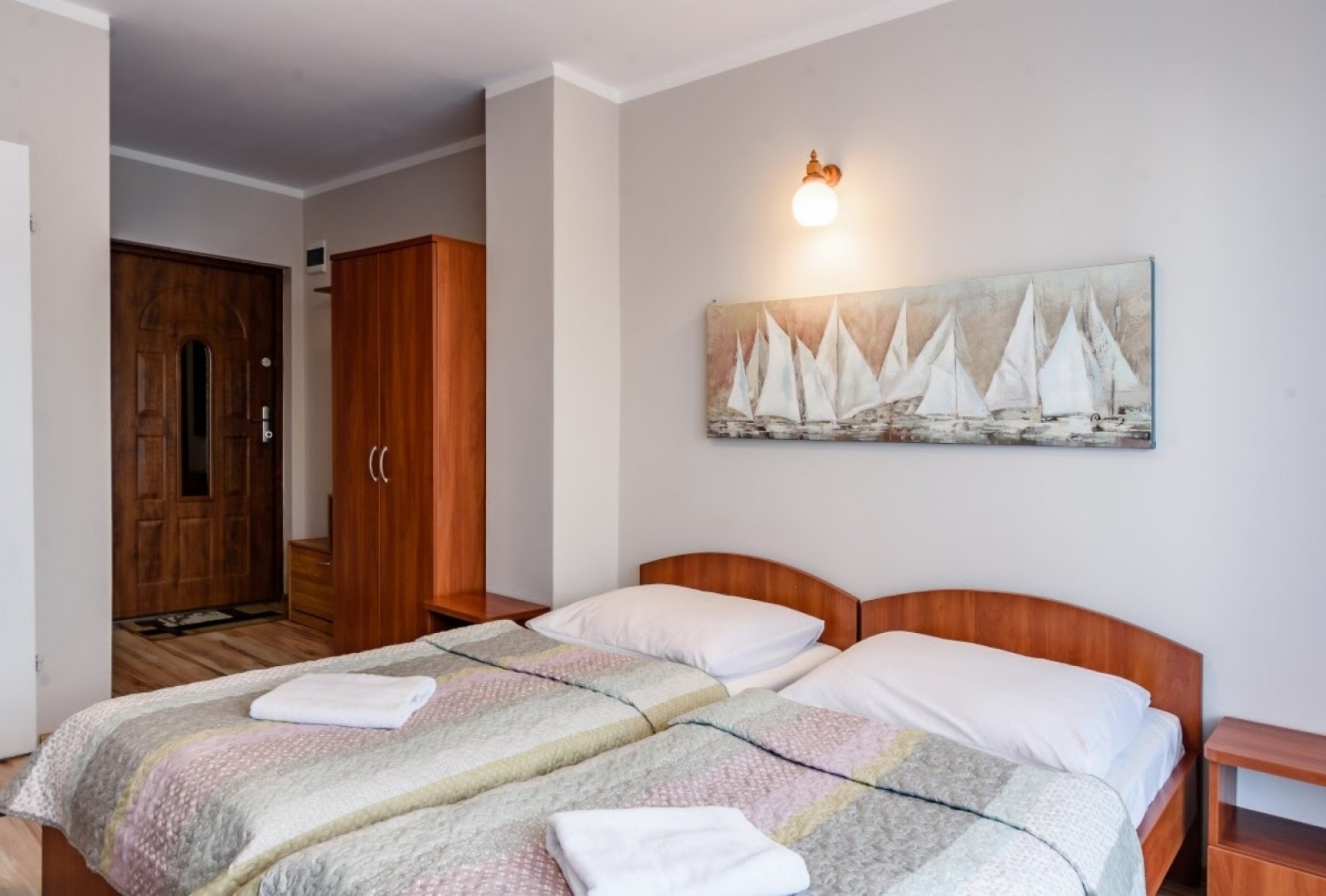 Pokoje 2 i 4-osobowe z łazienkami. Apartament rodzinny z aneksem kuchennym (II piętro) przeznaczony jest dla 4-5 osób. W pokojach 2-osobowych możliwość dostawki dla dziecka.