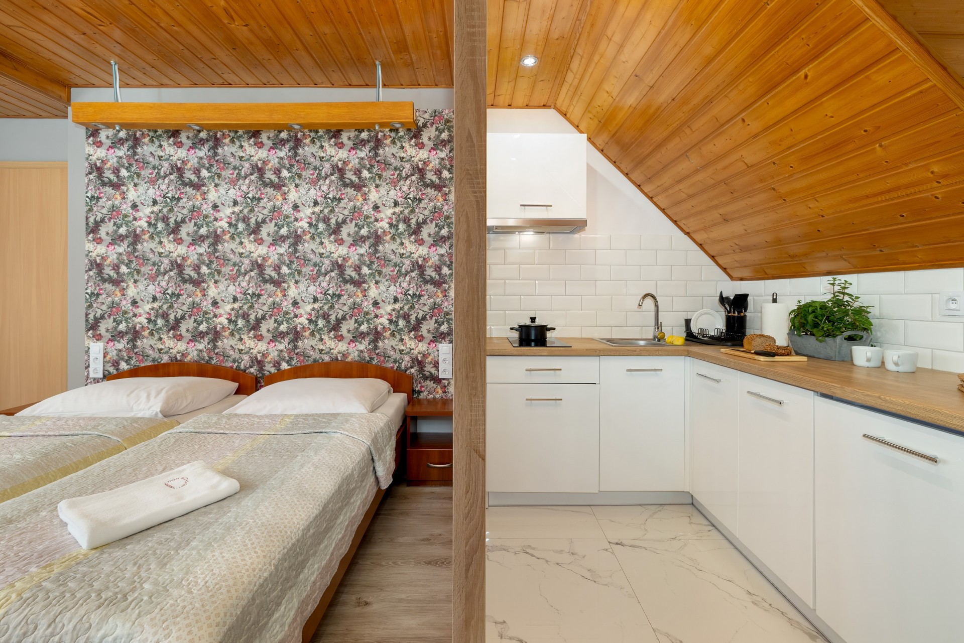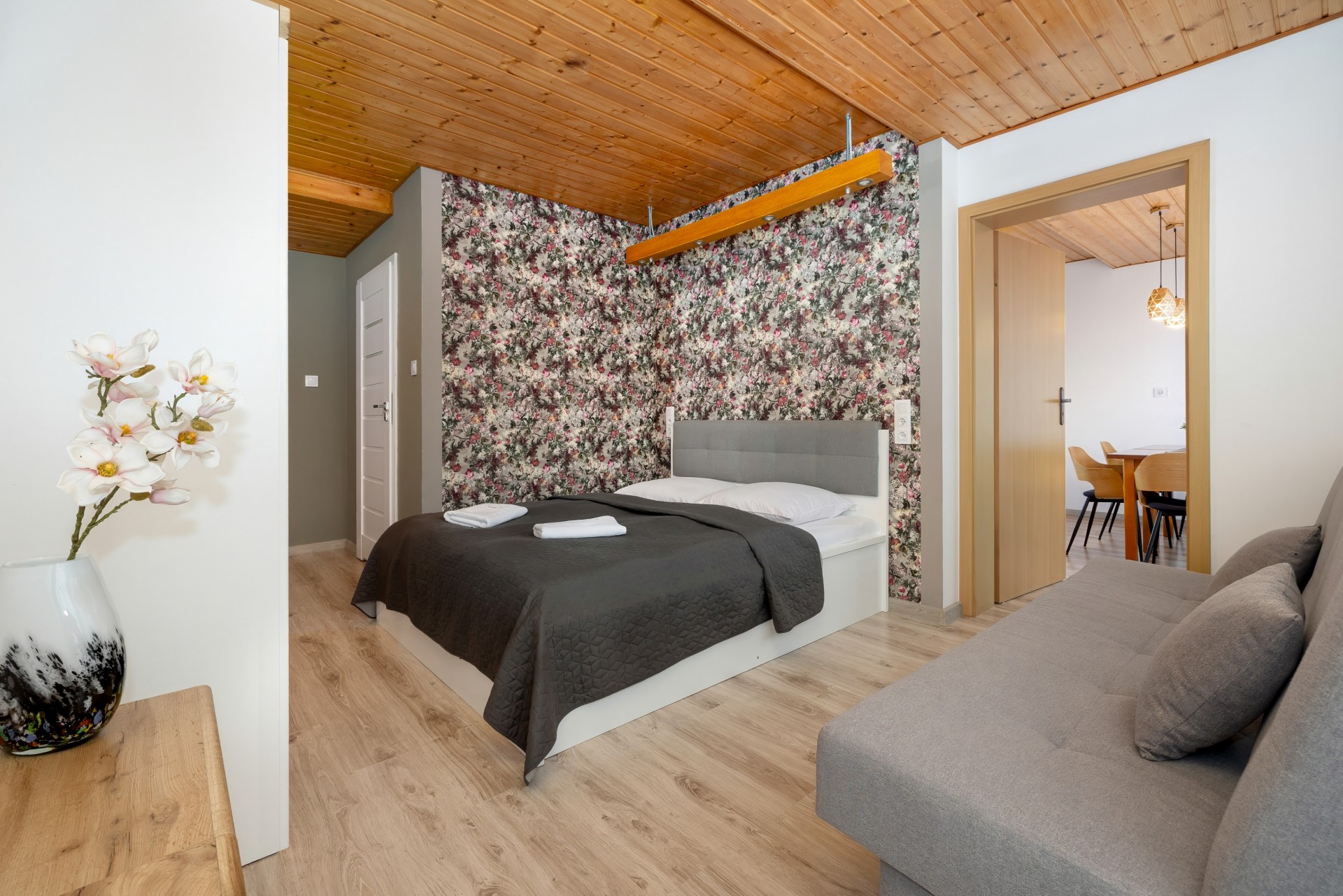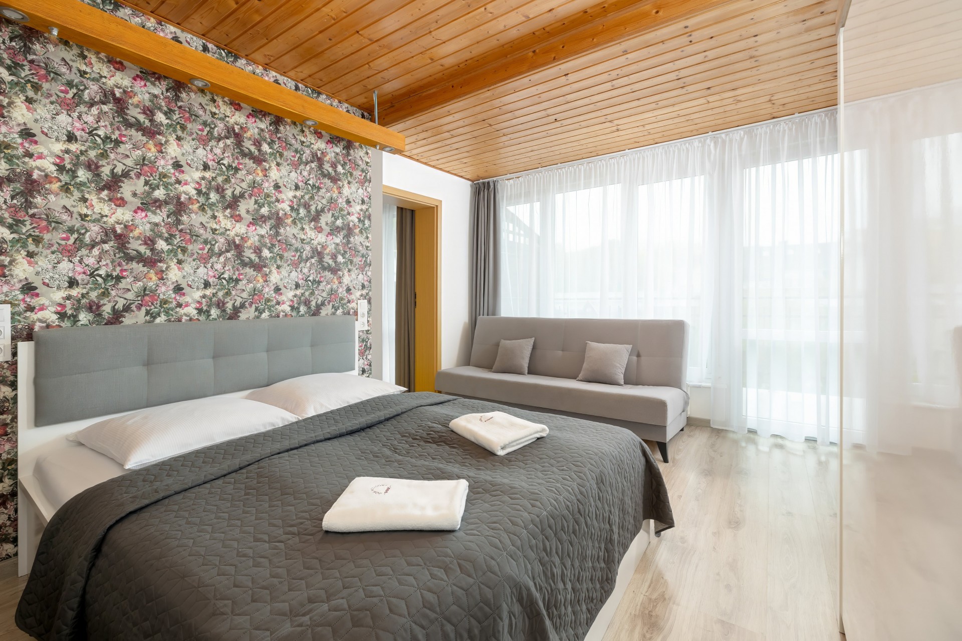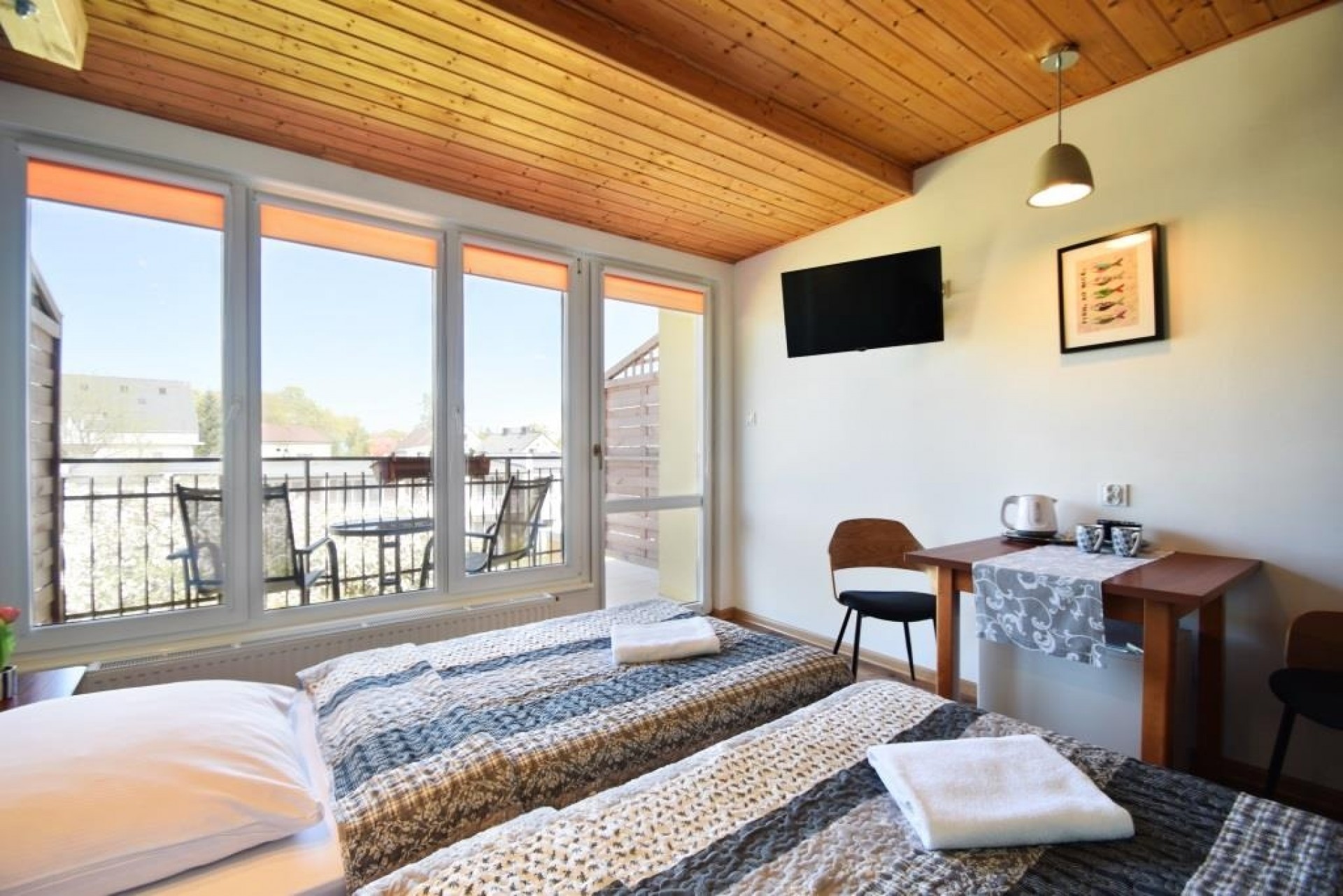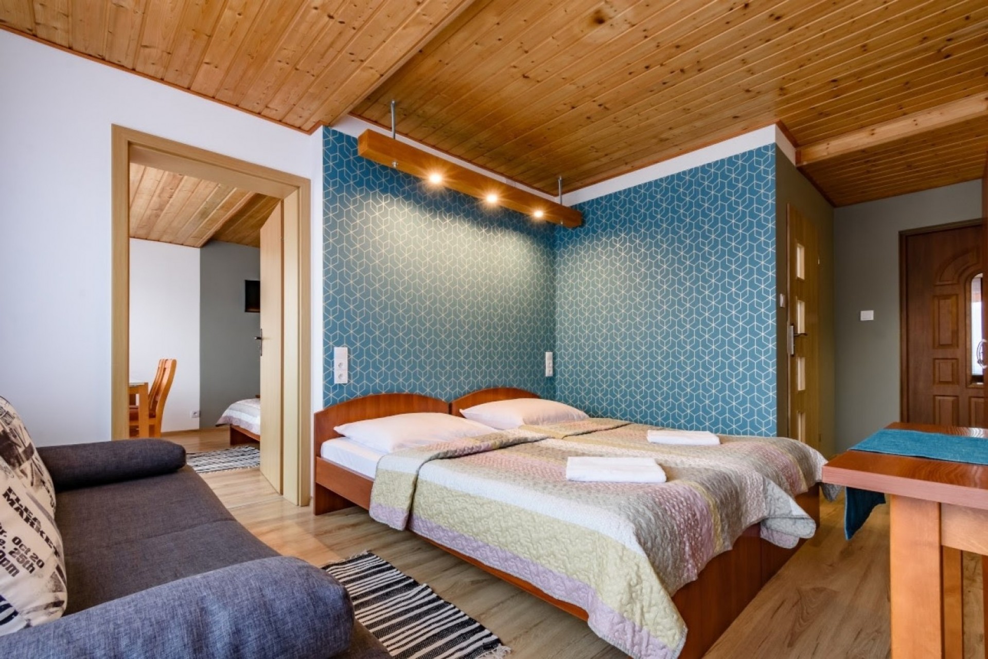 Pokoje 2 i 4-osobowe z łazienkami. Apartament rodzinny z aneksem kuchennym (II piętro) przeznaczony jest dla 4-5 osób. W pokojach 2-osobowych możliwość dostawki dla dziecka.