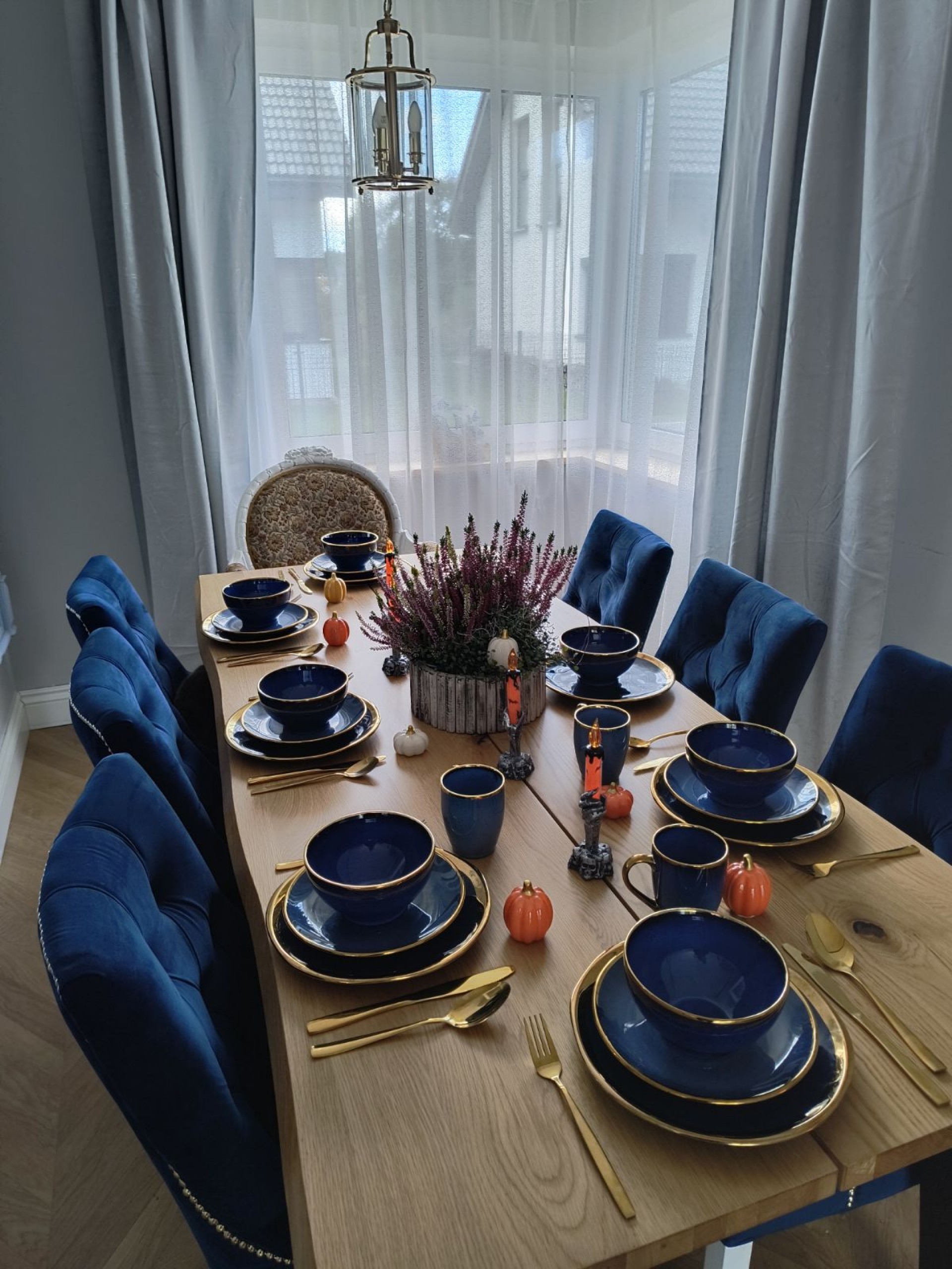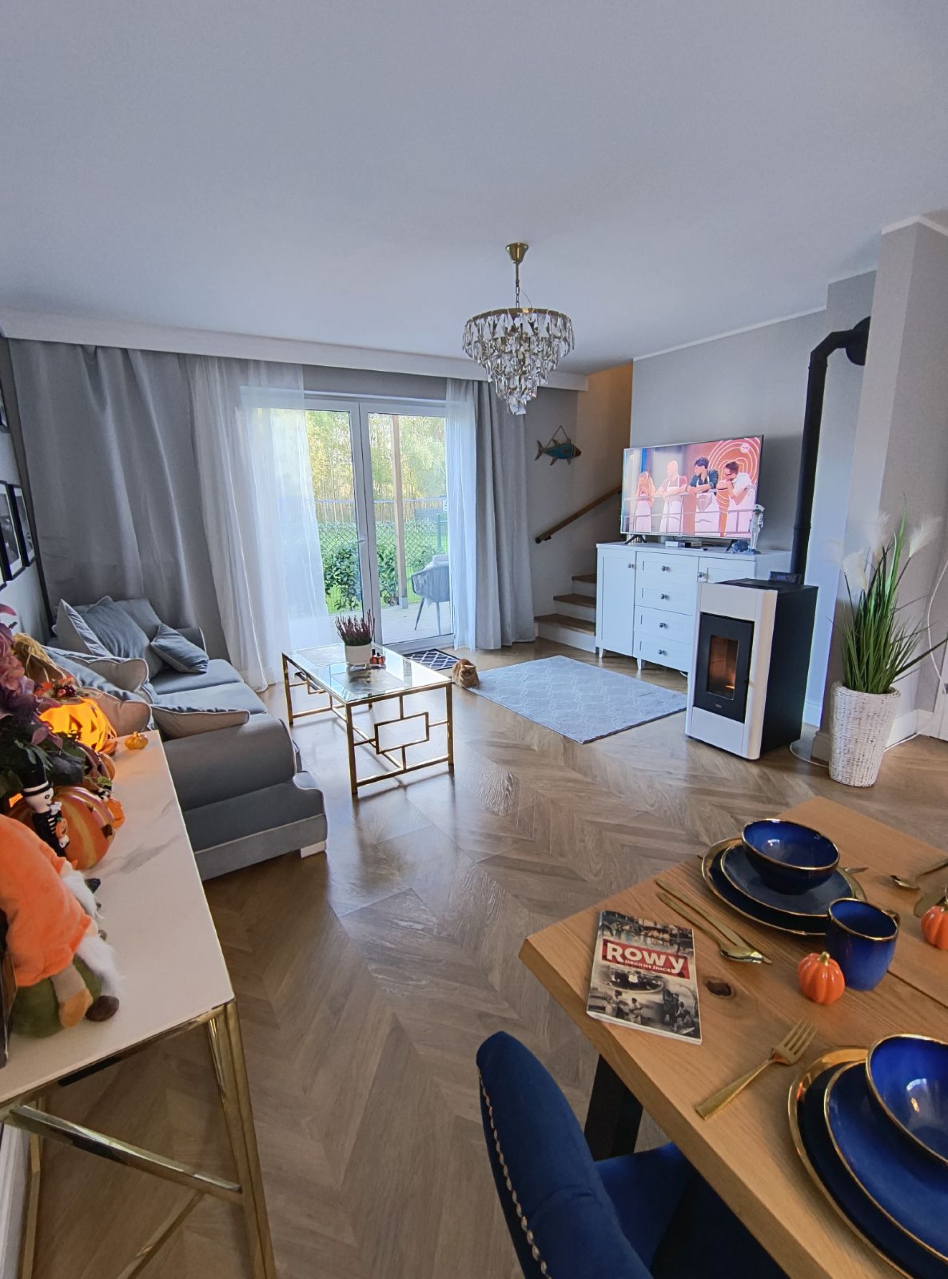 Na dole salon z sofą rozkładaną, jadalnia i duży stół na 8 osób i 8 krzeseł, toaletą i kuchnia.