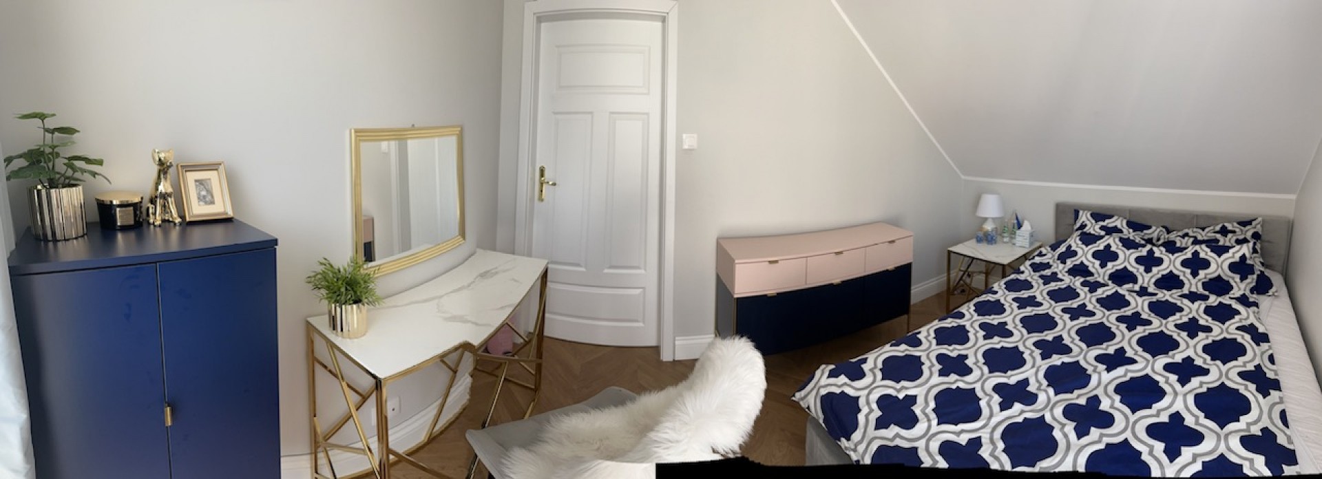 W sypialniach szafy, komody, stoliki nocne, lampki nocne, konsola, lustra.
