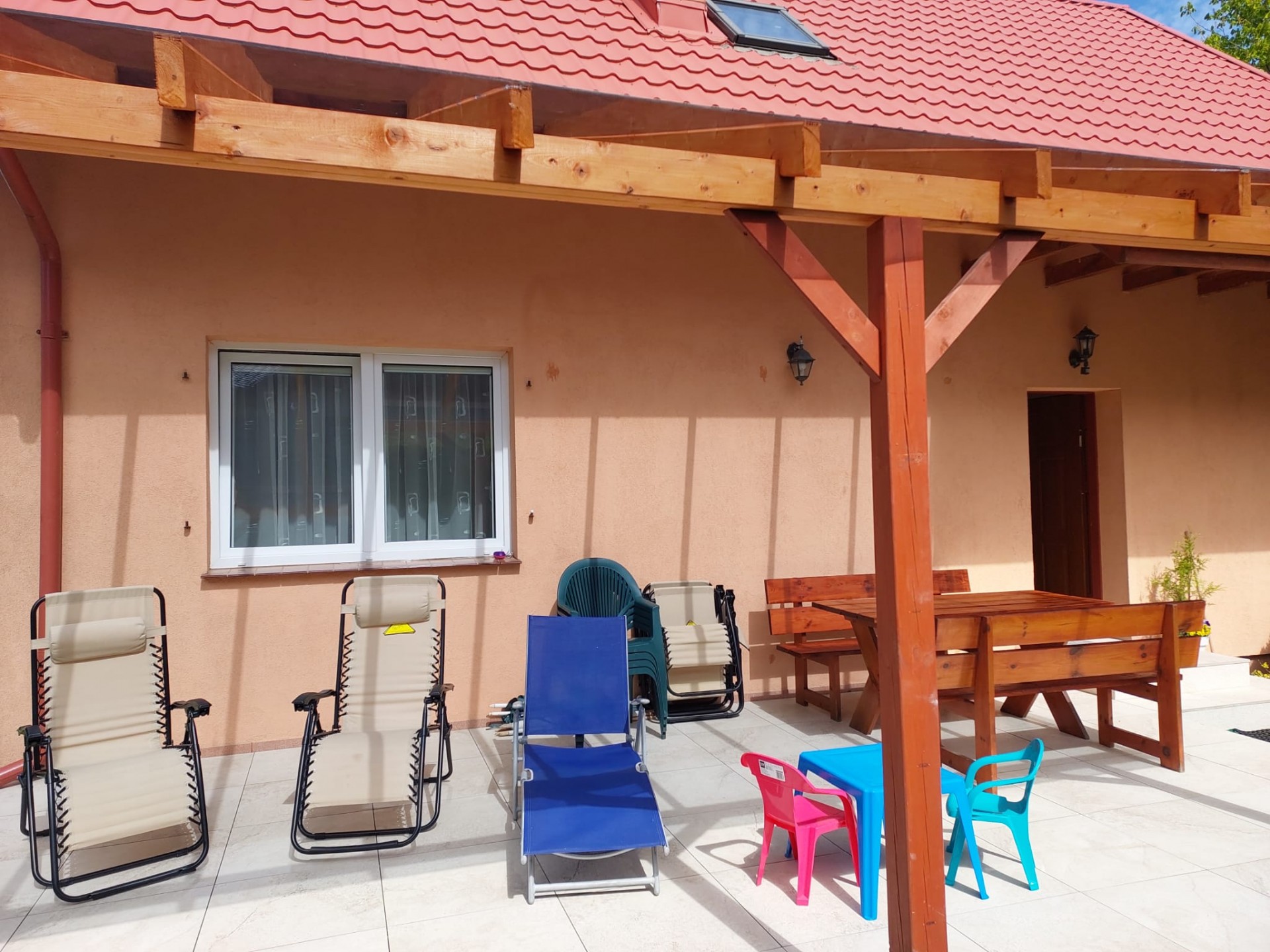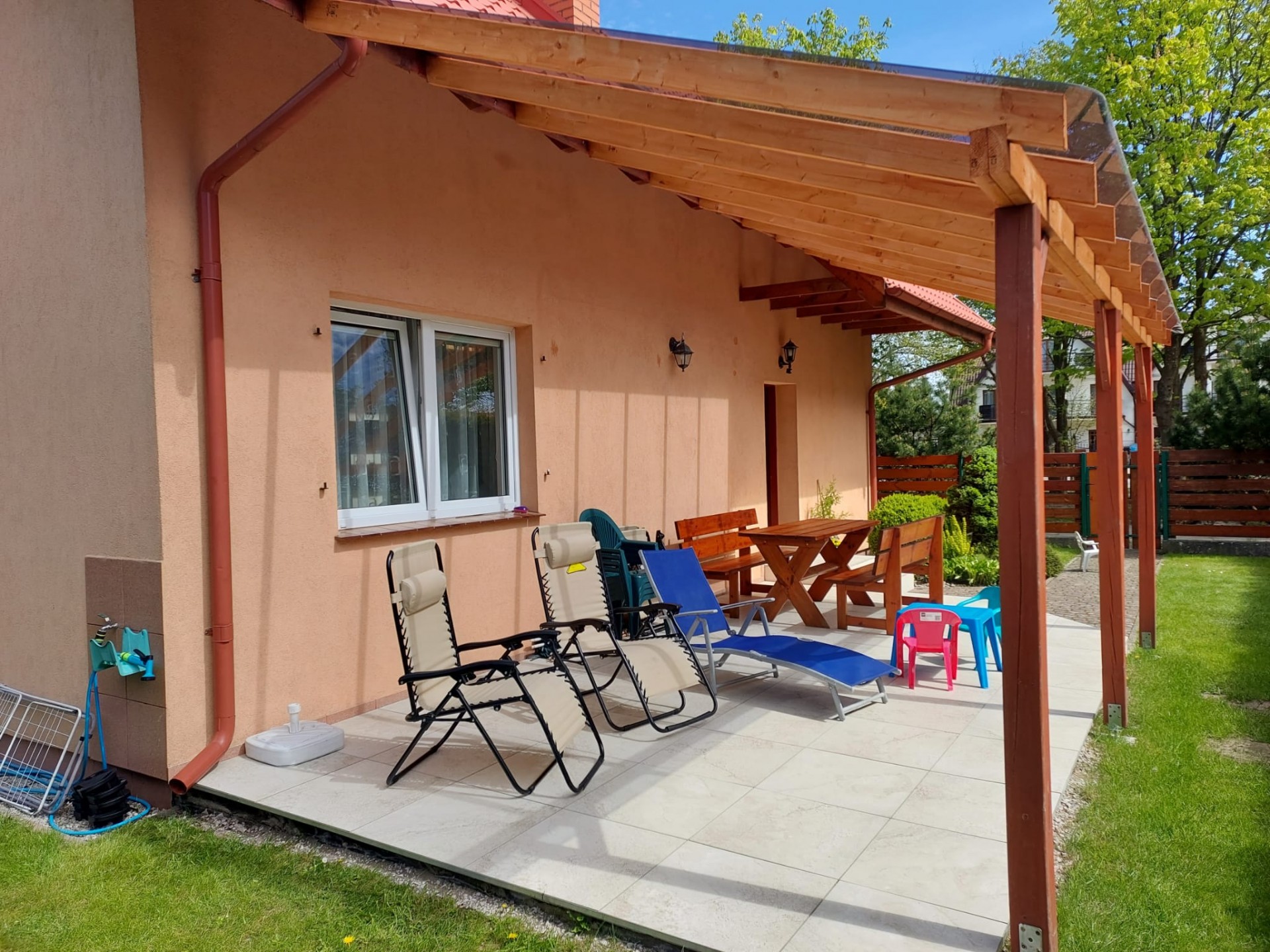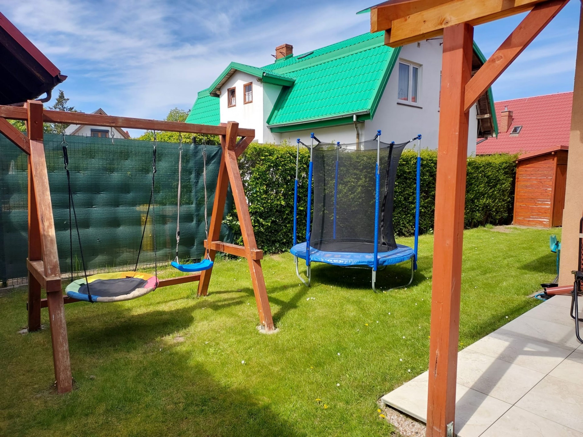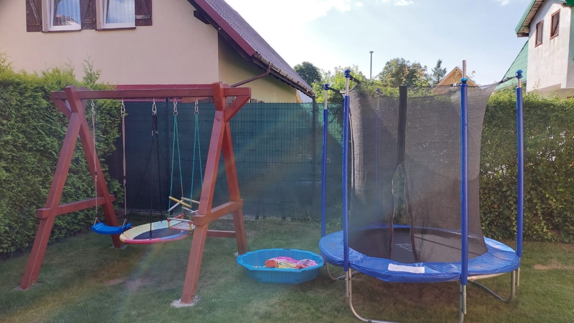 Teren każdego domku jest ogrodzony z możliwością zaparkowania. W ogrodzie miejsce do grillowania, meble ogrodowe, trampolina, zabawki oraz huśtawki dla dzieci.