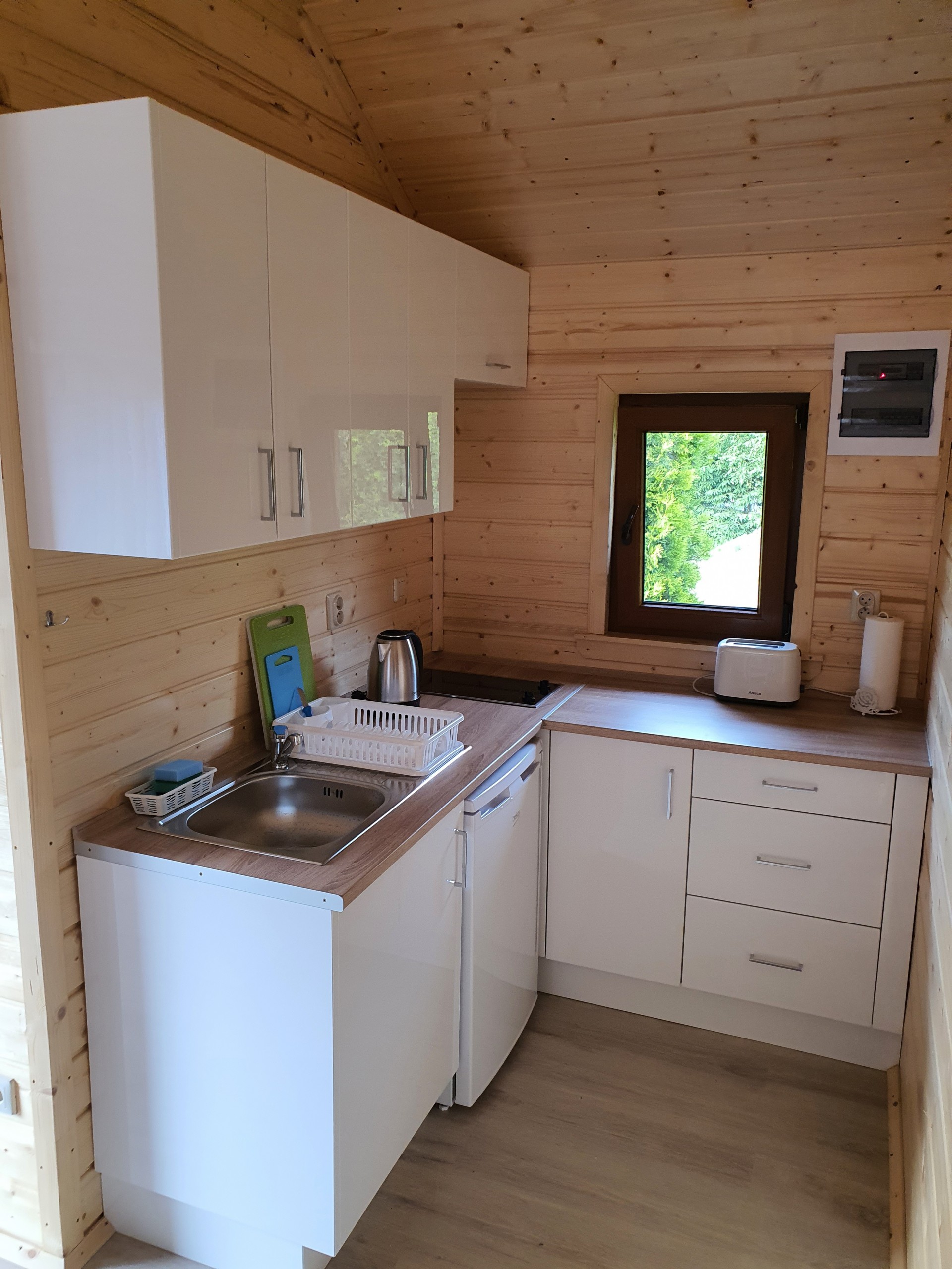- salonu z aneksem kuchennym (stół z krzesłami, rozkładana kanapa, telewizor LCD, lodówka, płyta ceramiczna, czajnik elektryczny, opiekacz do pieczywa, komplet garnków, naczyń oraz sztućców)