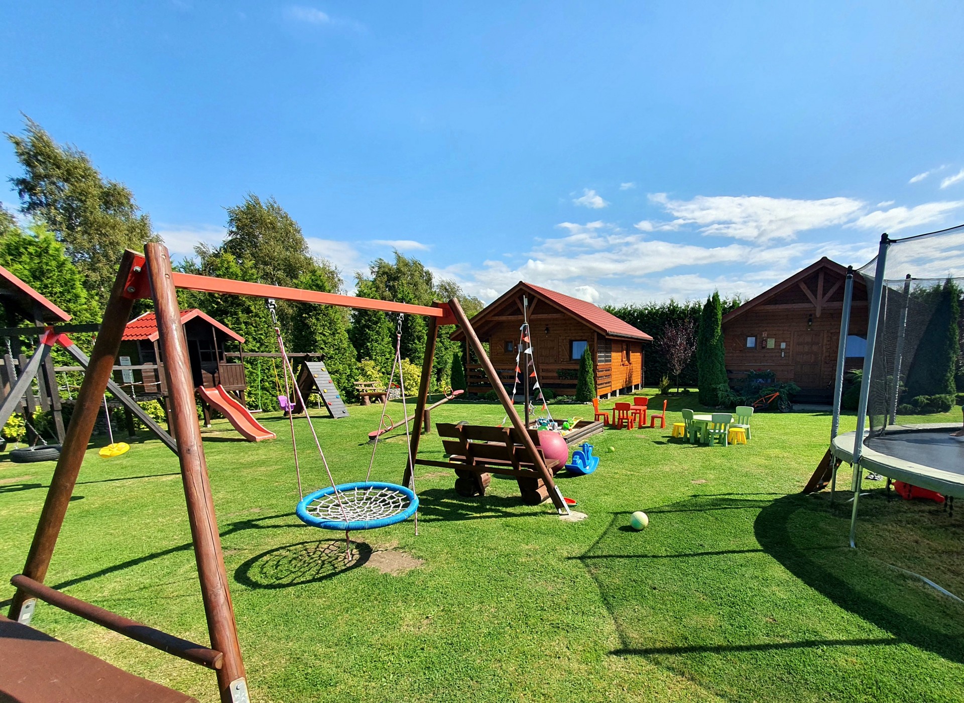 - plac zabaw dla dzieci (huśtawka “bocianie gniazdo”, huśtawki tradycyjne,trampolina, piaskownica, domek ze zjeżdżalnią, mini ścianka wspinaczkowa)