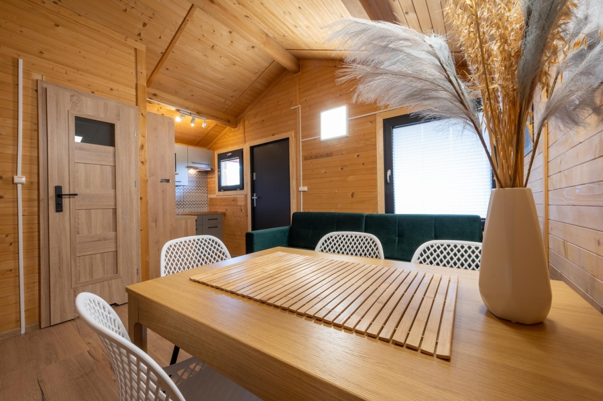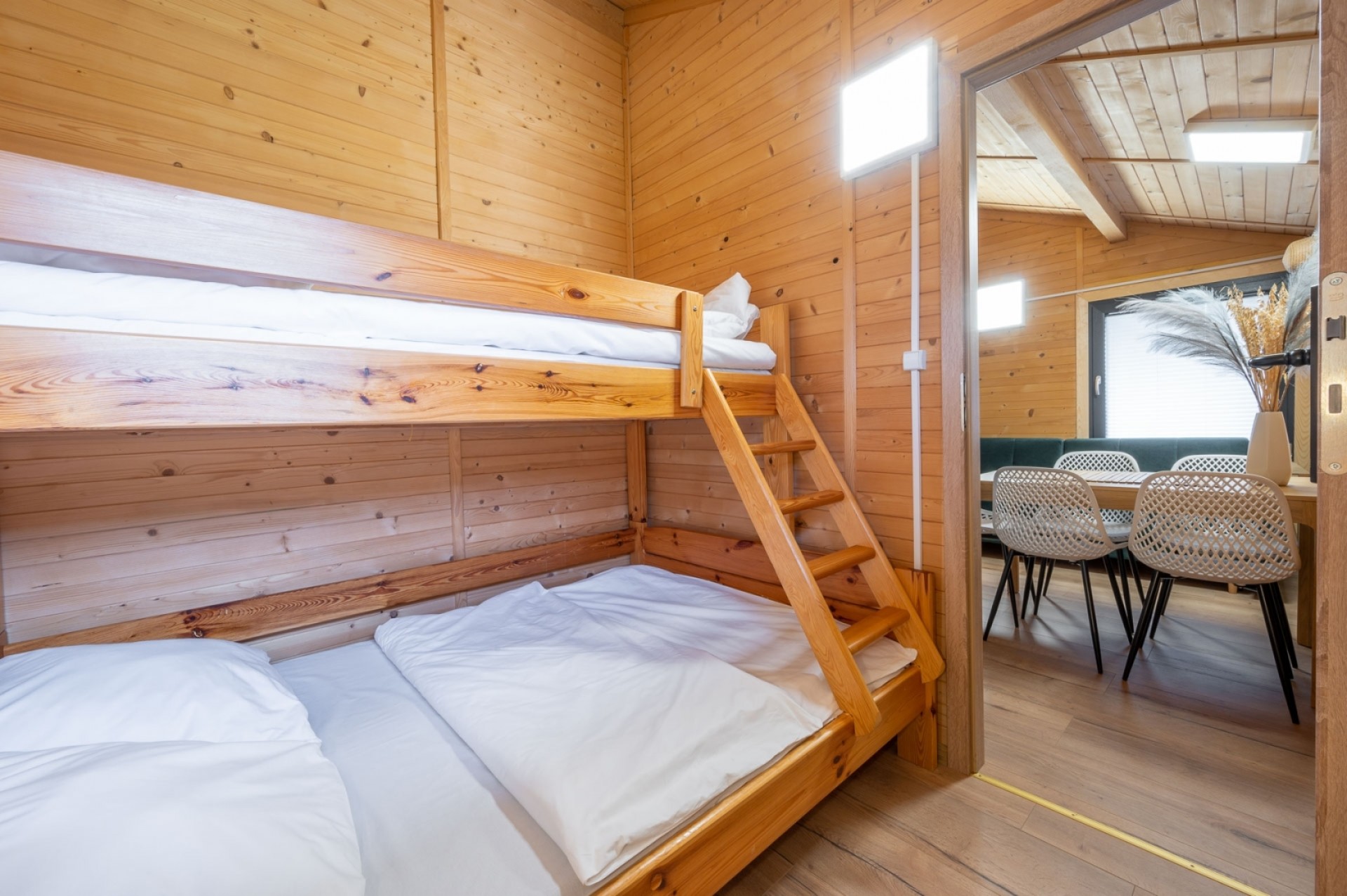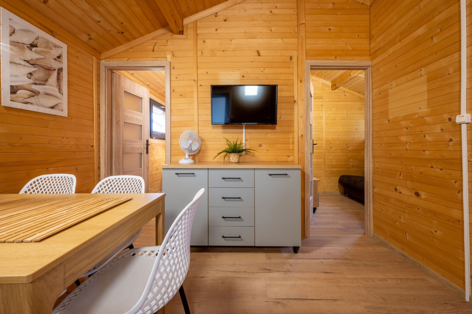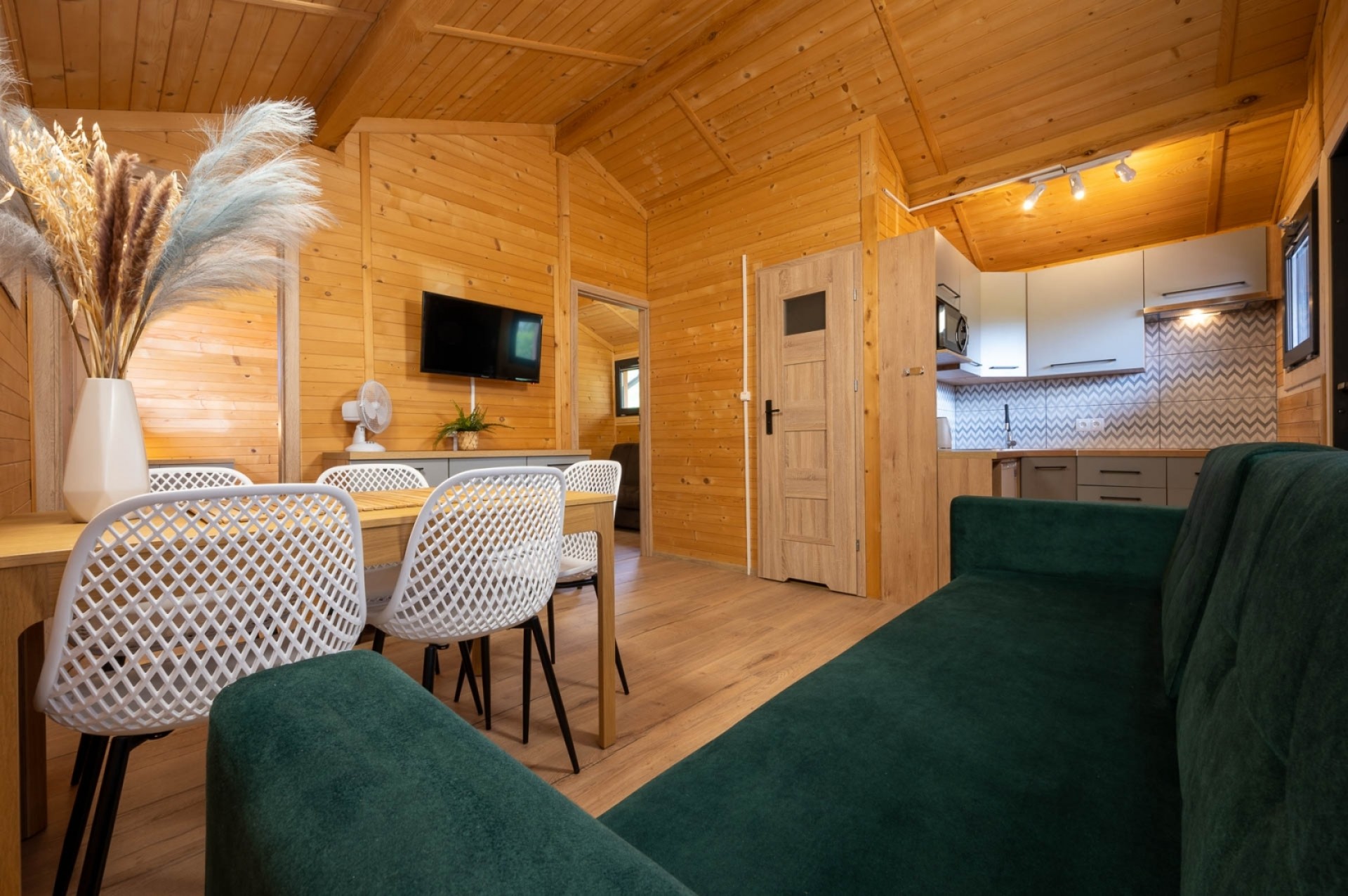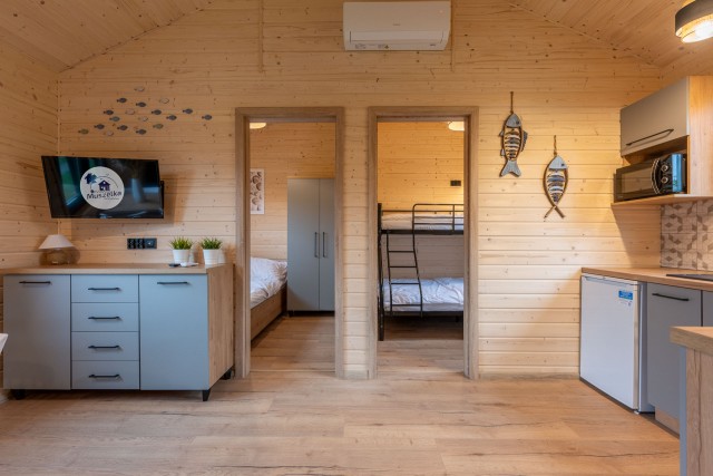W skład naszych domków wchodzi salon z rozkładaną kanapą wraz z aneksem kuchennym, łazienka, i dwie sypialnie. W jednej z nich znajduje się trzyosobowe łóżko piętrowe, a w drugiej łóżko małżeńskie. No i oczywiście taras! Najważniejsze miejsce dla wszystkich urlopowiczów, kojarzące się z zapachem grilla, kwintesencja każdego urlopu.