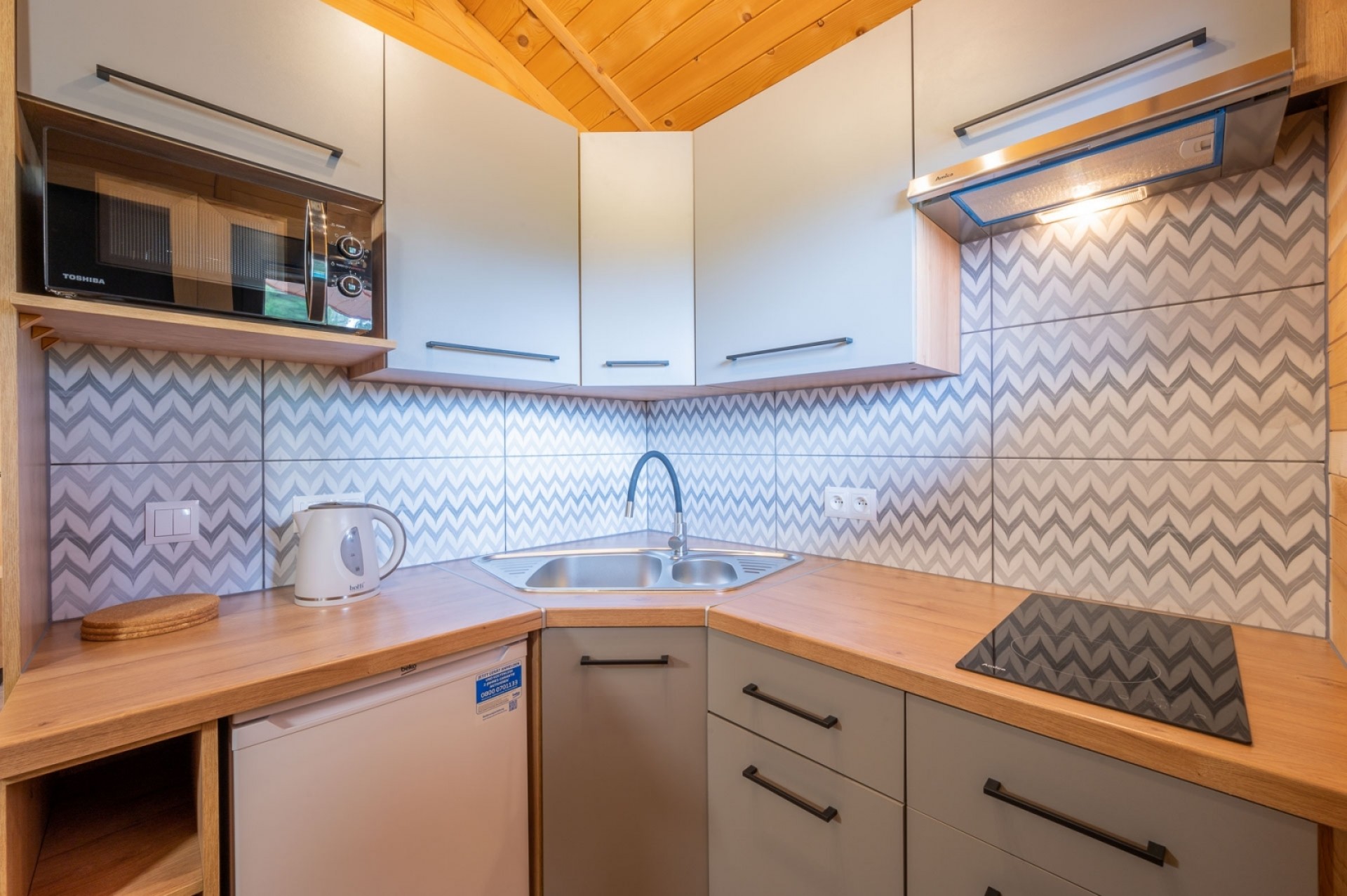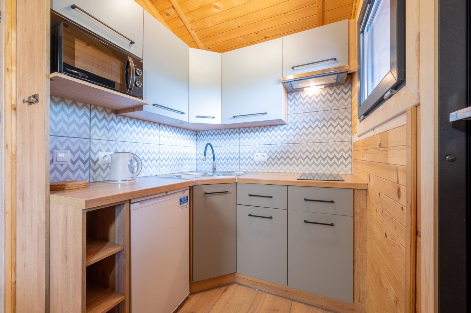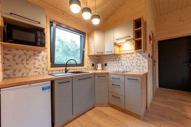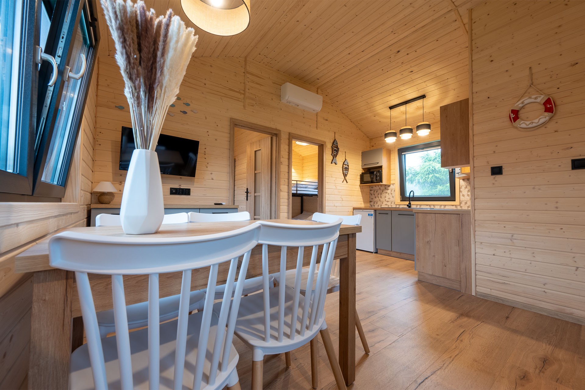 Każdy z 15 domków został usytuowany w taki sposób aby dawać swobodę i intymność. W 2023 roku domki zostały wyremontowane, a ich wyposażenie wymienione na zupełnie nowe! Dla zapewnienia komfortu zostały wyposażone w klimatyzacje, a okna w moskitiery i rolety. Nowoczesne kuchnie, z dużą ilością miejsca do przechowywania, lodówka, płyta indukcyjna, czajnik, komplet nowych talerzy, garnków, sztućców i wszystkiego co niezbędne do samodzielnego przygotowania posiłków. Jeśli natomiast nie masz na to ochoty podpowiemy Ci gdzie można zjeść pyszną rybkę!