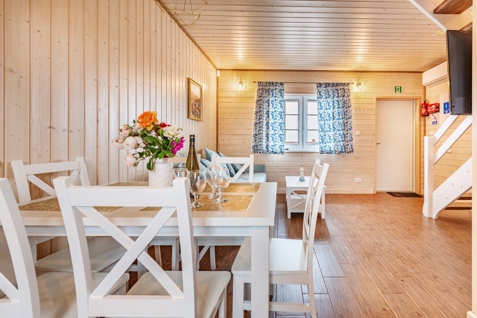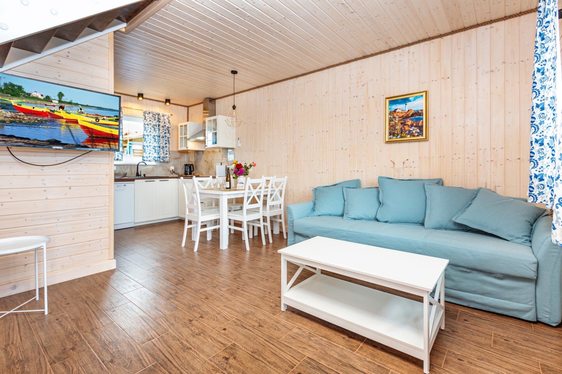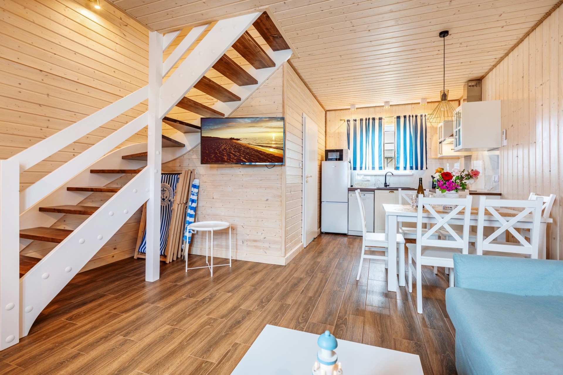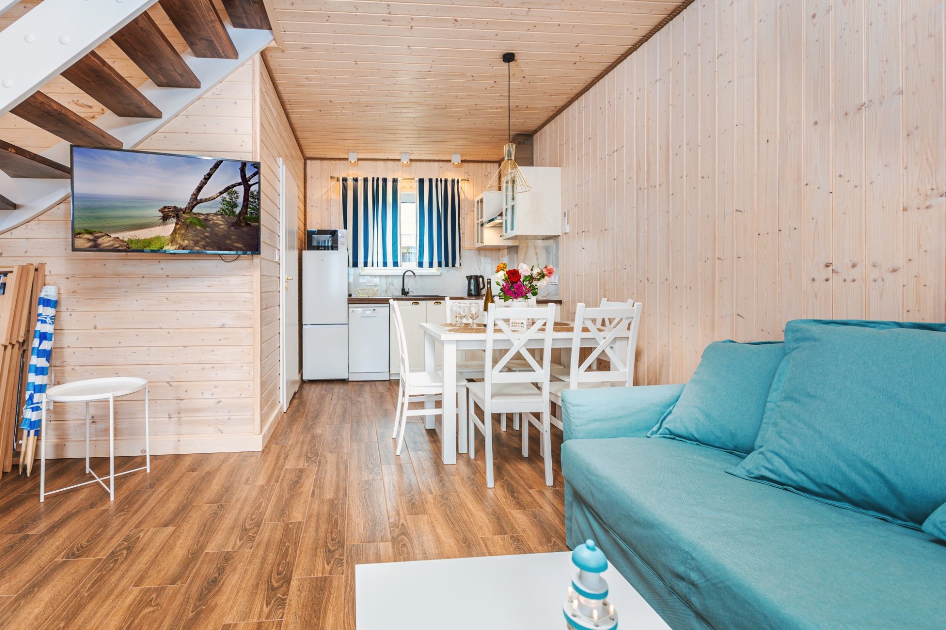Na parterze domku jest salon z sofą, TV, stolikiem kawowy, stołem z krzesłami, aneksem kuchennym w pełni wyposażonym, łazienką z prysznicem i pralką.