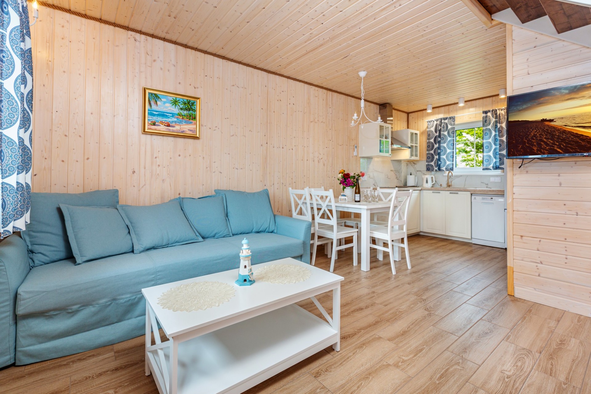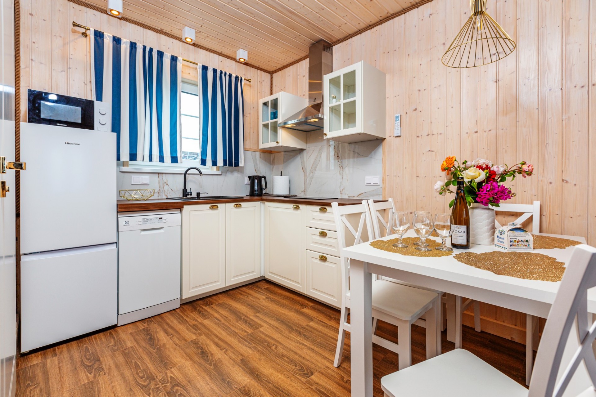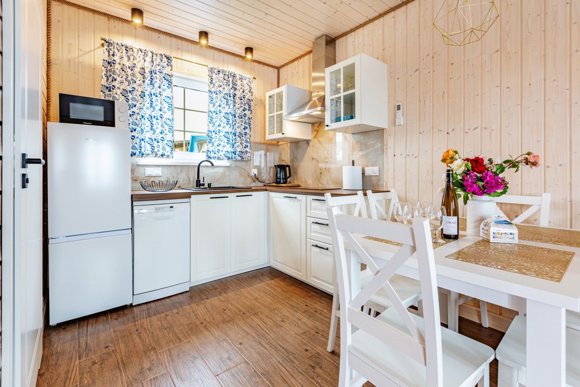 Na parterze domku jest salon z sofą, TV, stolikiem kawowy, stołem z krzesłami, aneksem kuchennym w pełni wyposażonym, łazienką z prysznicem i pralką.