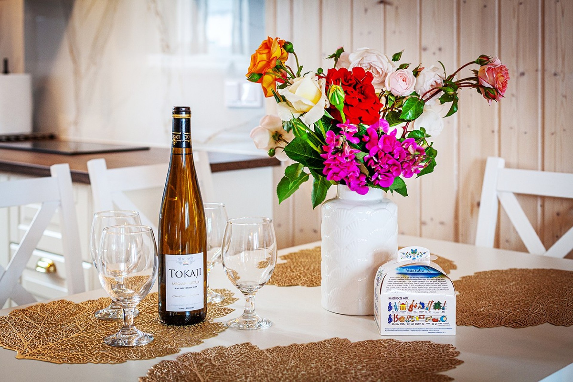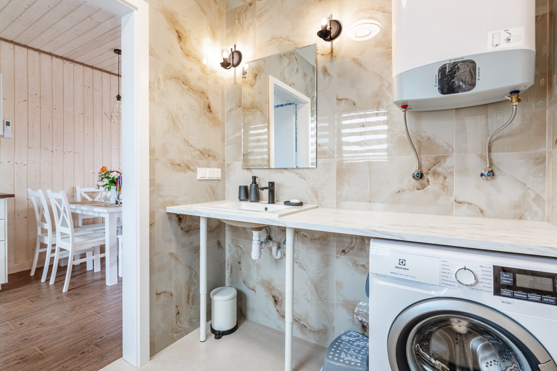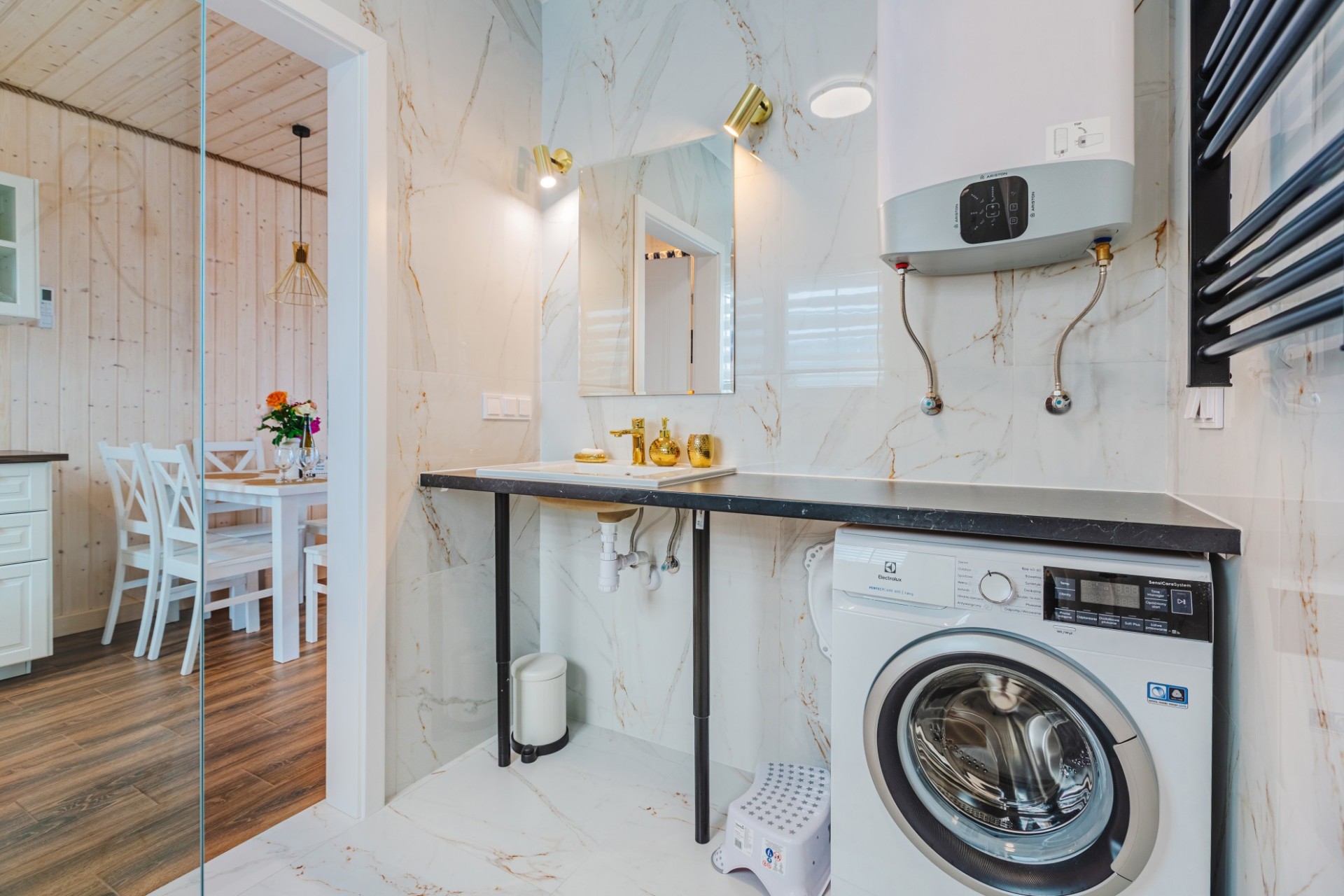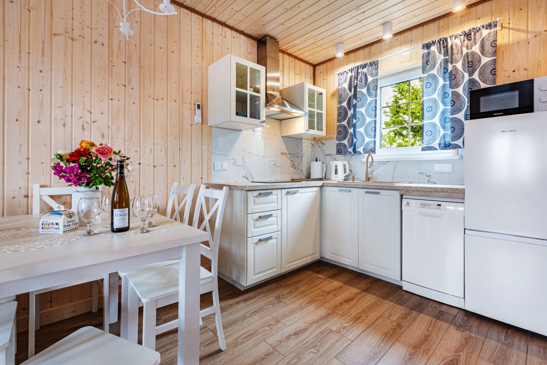 Na parterze domku jest salon z sofą, TV, stolikiem kawowy, stołem z krzesłami, aneksem kuchennym w pełni wyposażonym, łazienką z prysznicem i pralką.