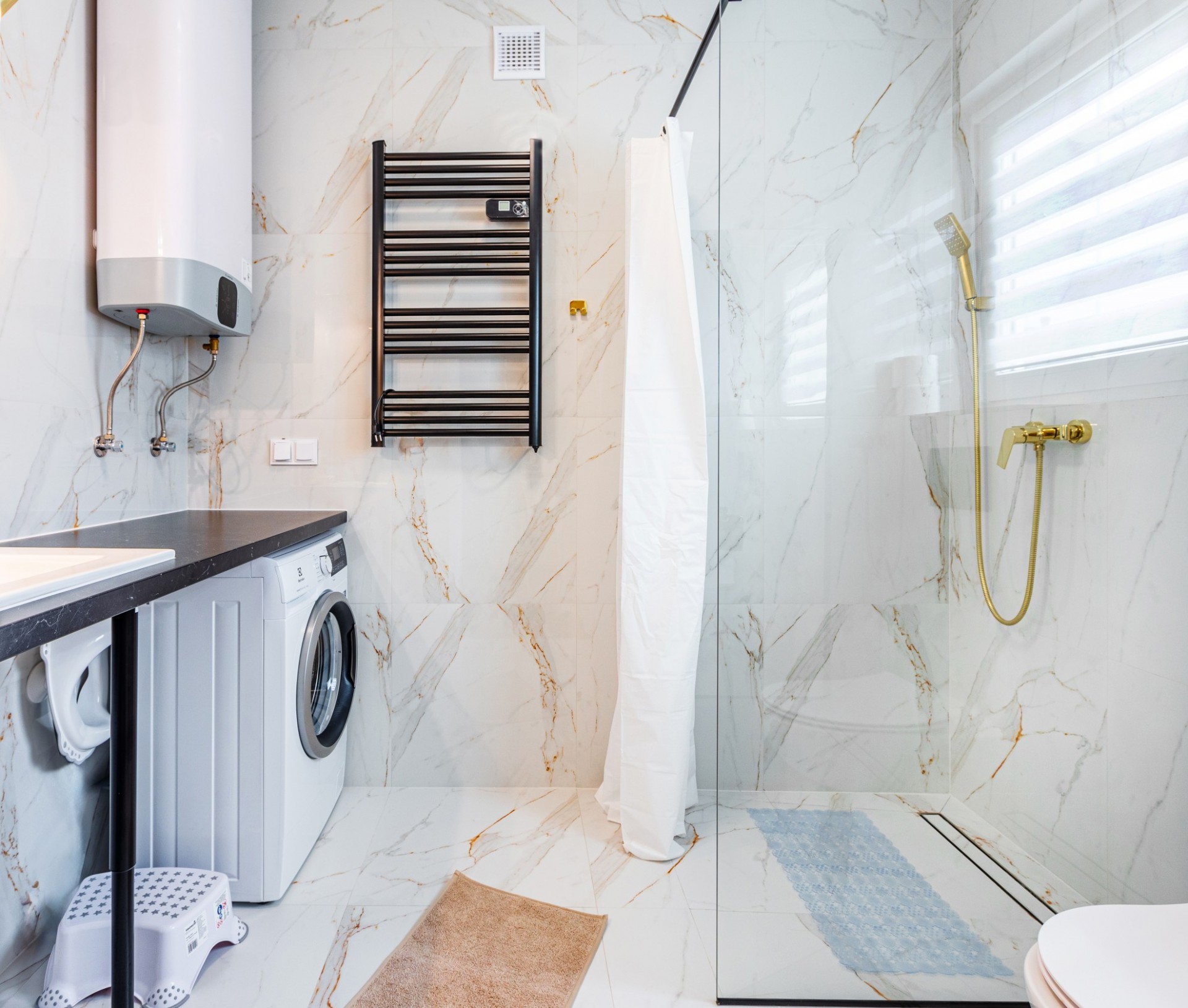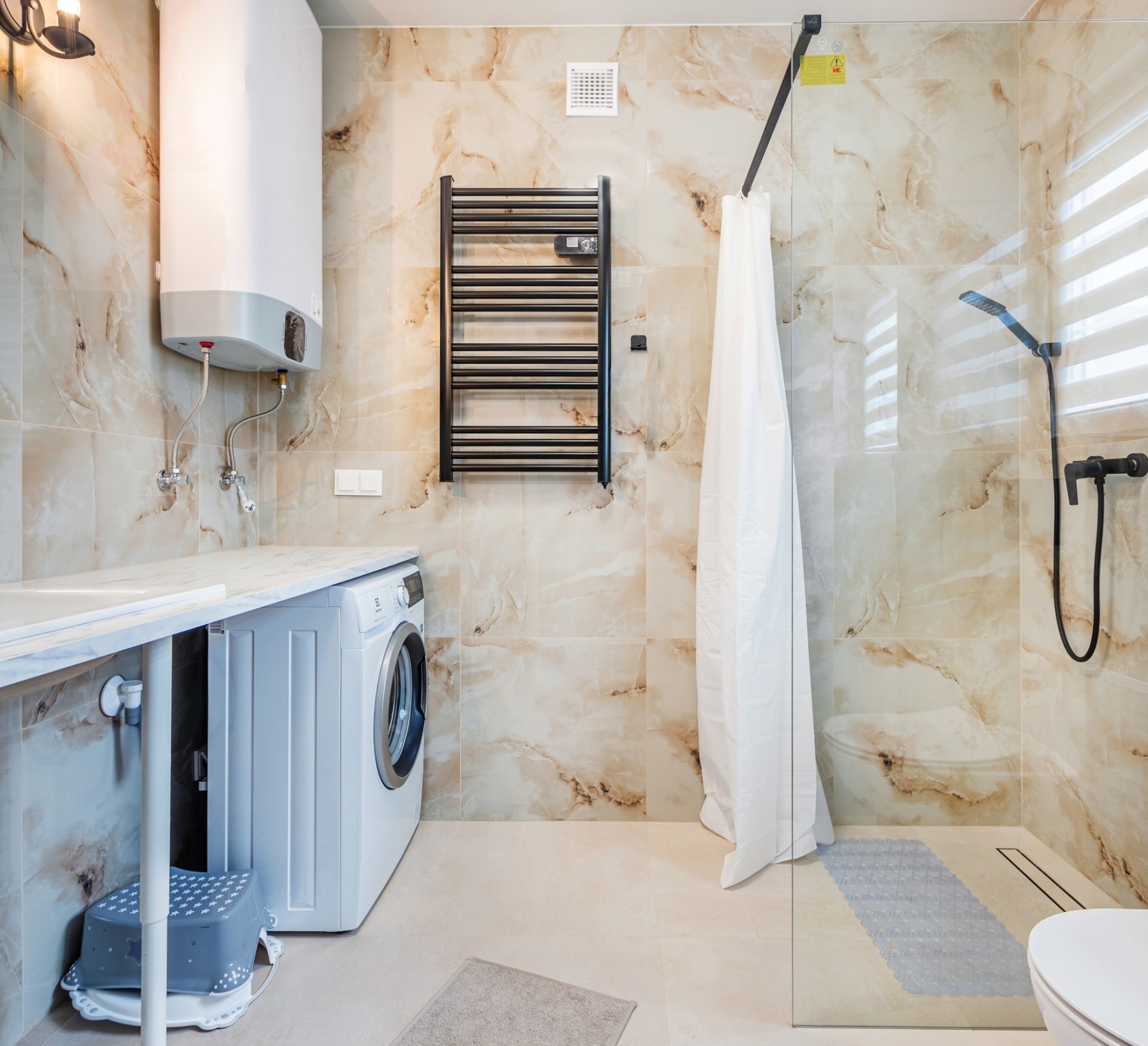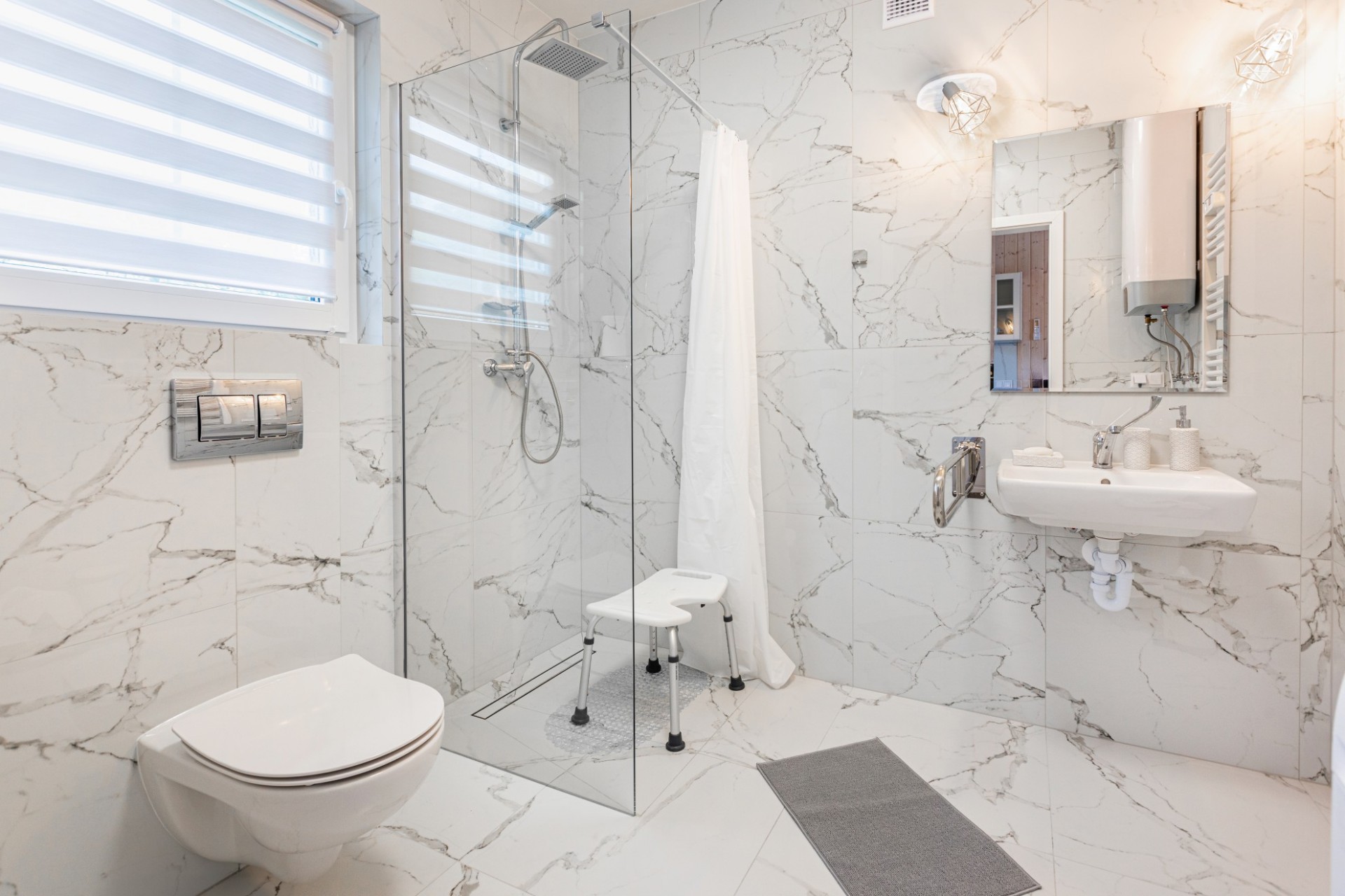 Przed tarasem jest szeroki podjazd, by można swobodnie wjechać wózkiem, ale również szerszy parking i większa łazienka z uchwytami oraz krzesełkiem pod prysznic.
